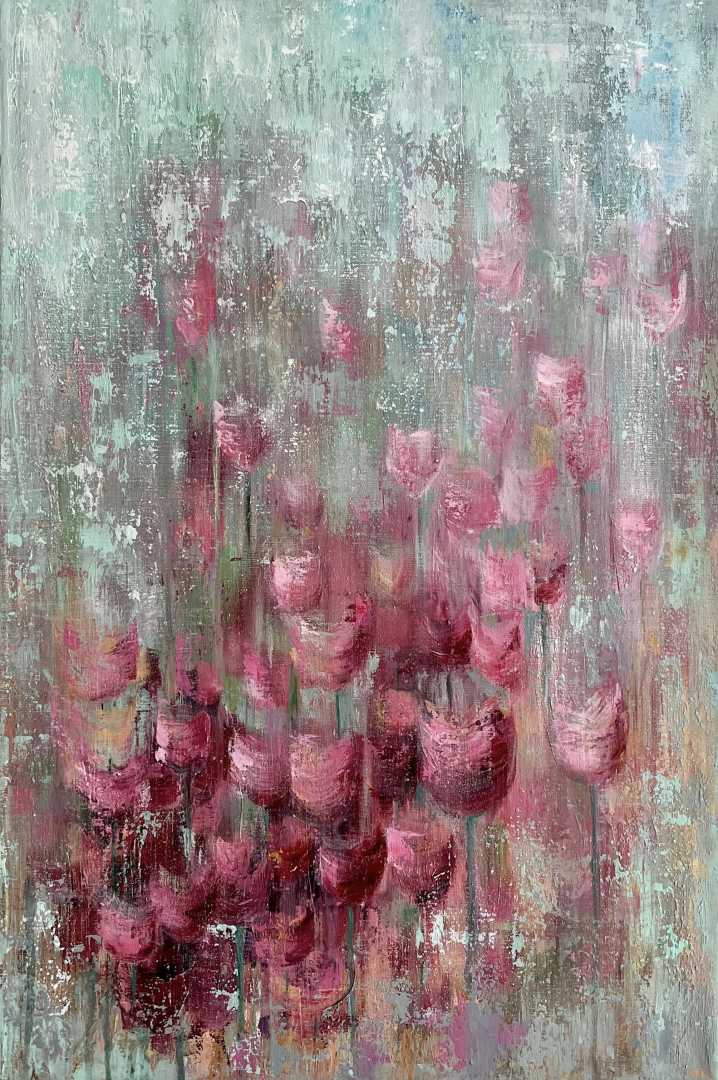 Первые лучи солнца; касаются спящего поля, и абстрактные формы тюльпанов 🌻 начинают просыпаться в тихом сиянии. Холодные тени ночи отступают, уступая место нежному розовому золоту и вспышкам сочного алого. Эта работа — про самое начало, про надежду и хрупкую красоту, которая рождается прямо