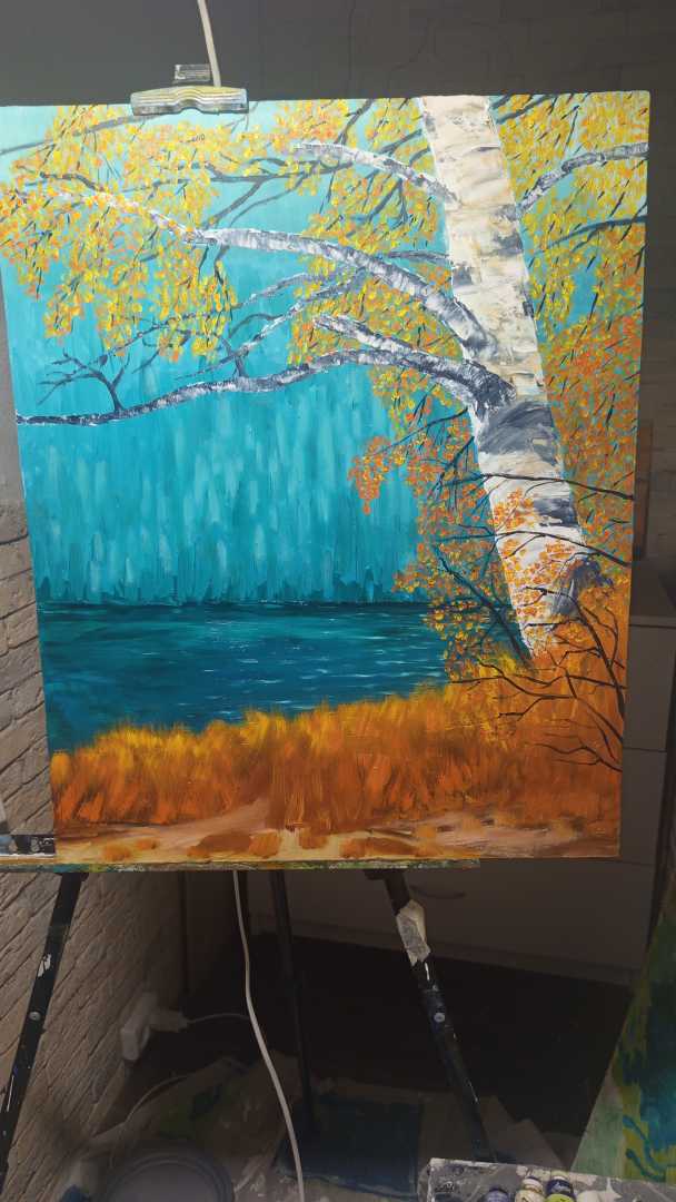 нтами золотистой листвы и прохладной синевы воды формирует атмосферу созерцания и внутреннего покоя. Картина воспринимается как остановленный момент природы, в котором нет суеты и напряжения.