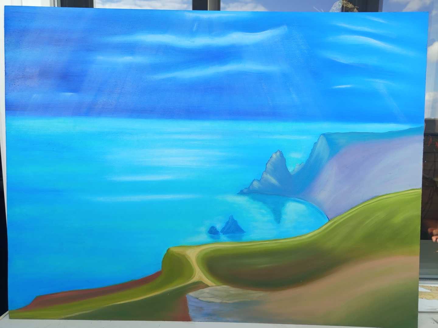 Картина «Бирюзовый берег» — это современный морской пейзаж, наполненный ощущением простора и спокойствия. Гладкие цветовые переходы, мягкие линии берега и глубокие оттенки бирюзового создают атмосферу тишины и созерцания.