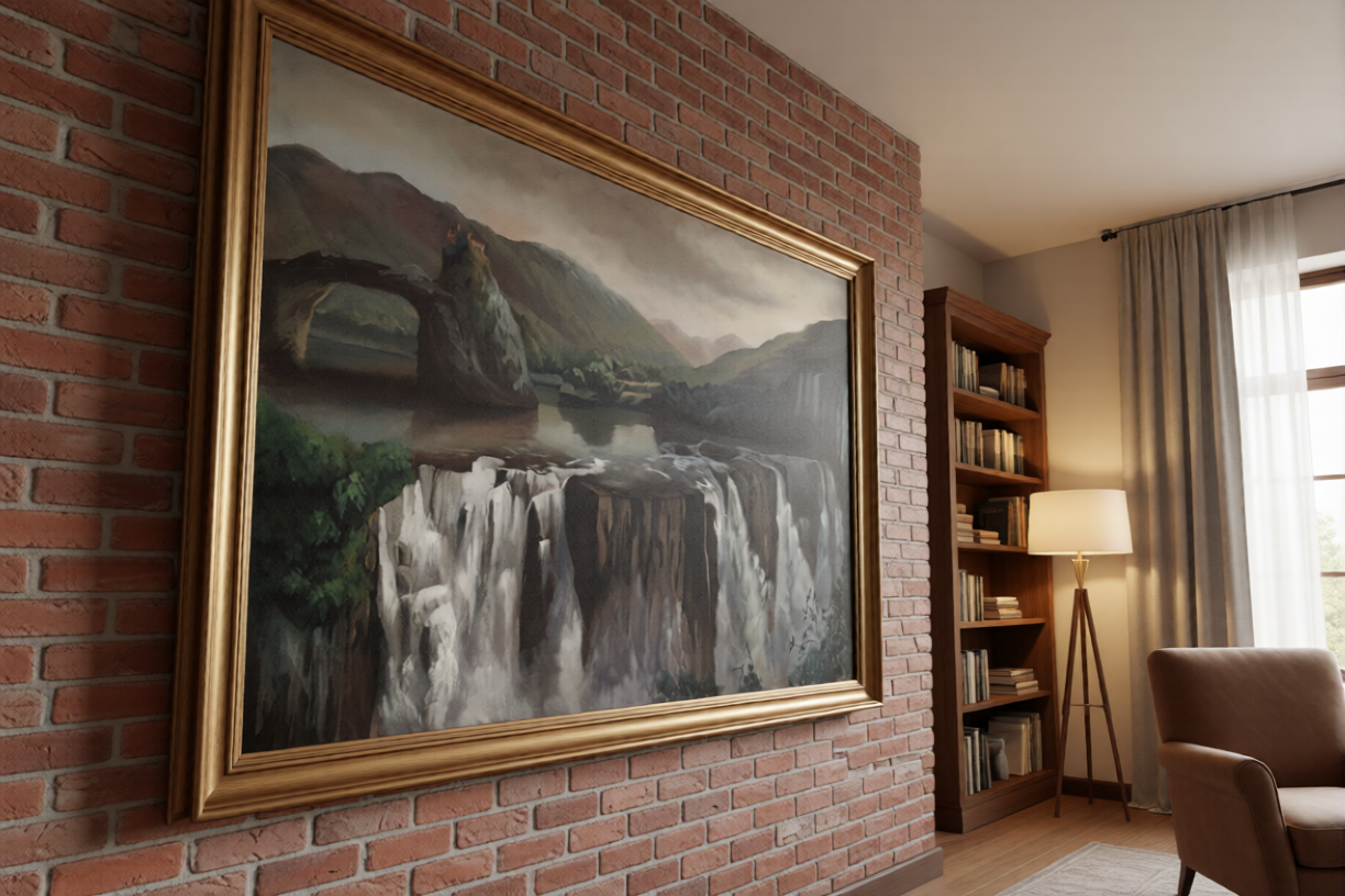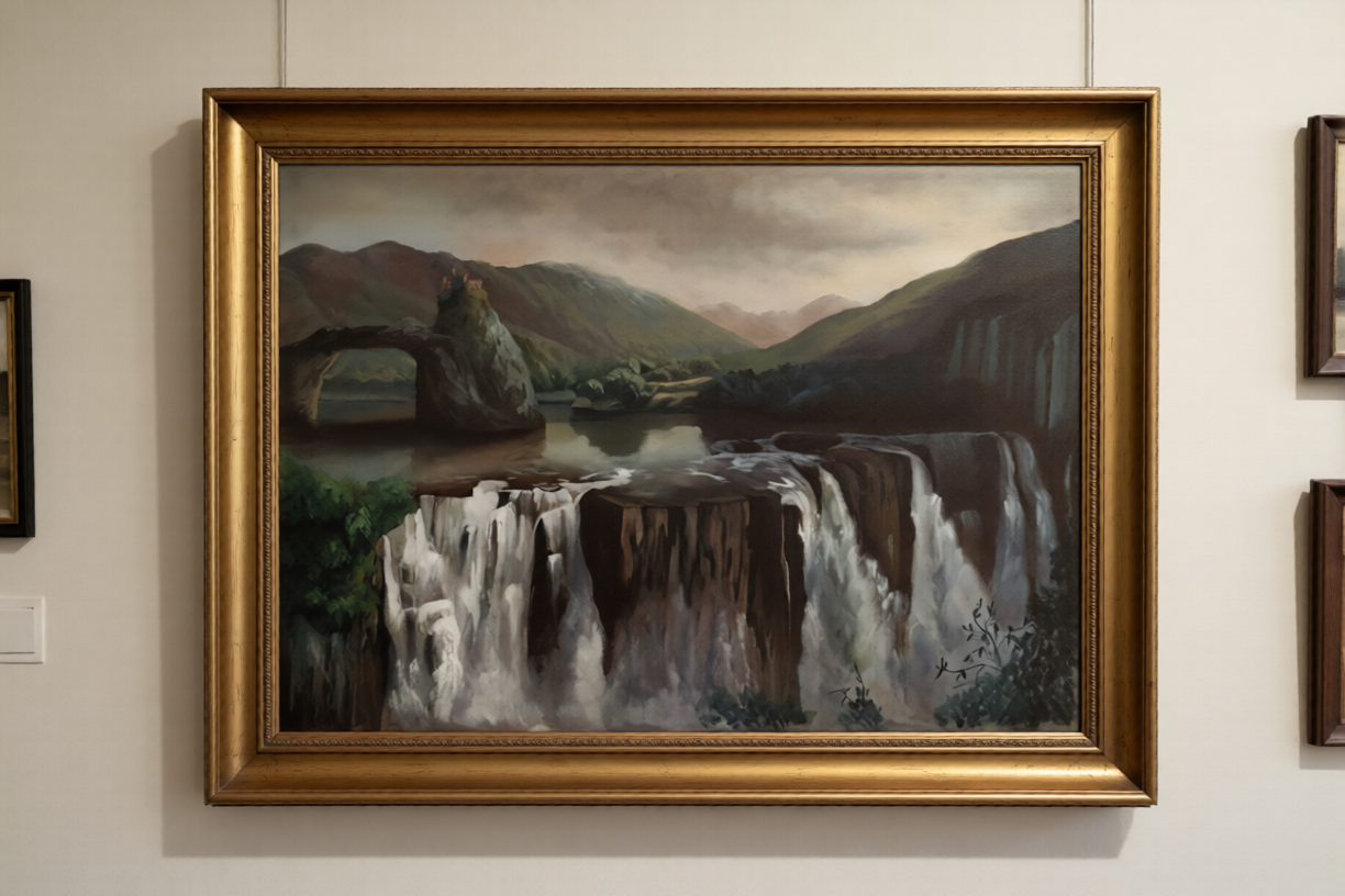Картина "Падающий водопад" изображает водопад в горном пейзаже, написана маслом на холсте, размер картины 40*60
