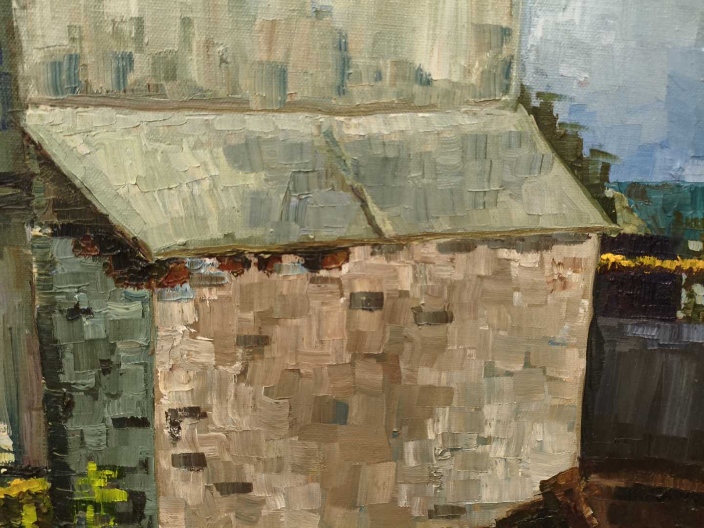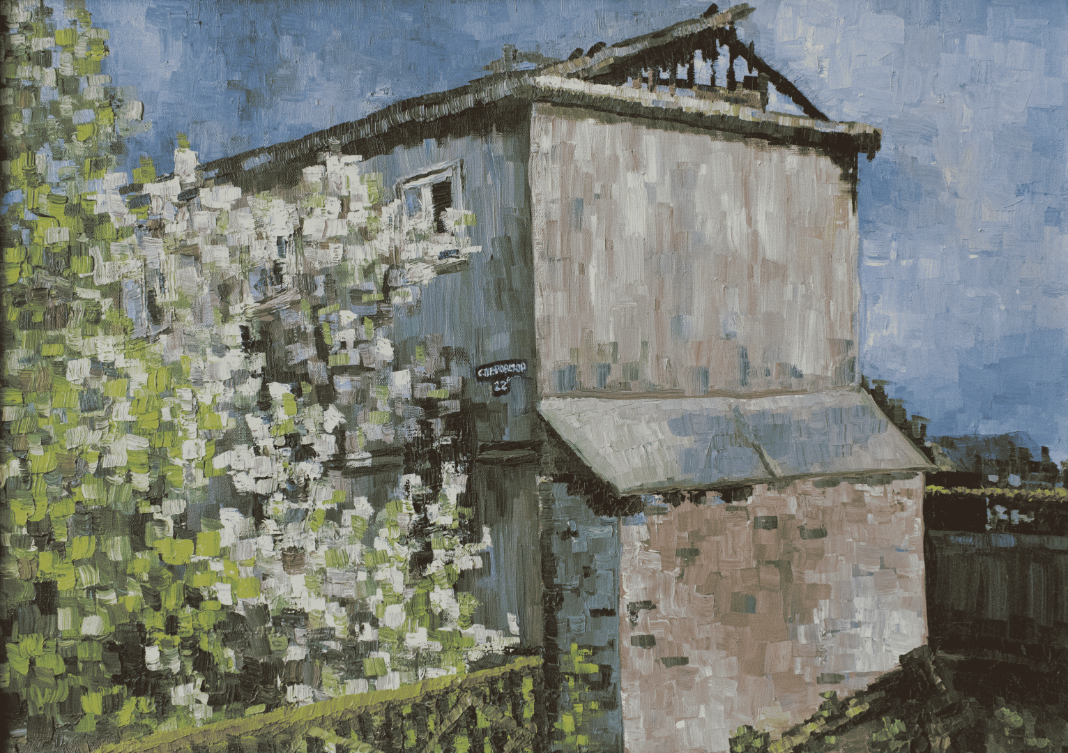 Я написала этот дом, когда цвела сирень, успела запечатлеть эту усталую постройку до того, как через некоторое время ее не стало. Картина передает тепло только начинающегося лета, когда все хорошее еще впереди.