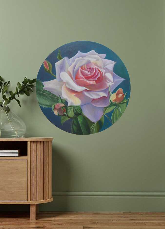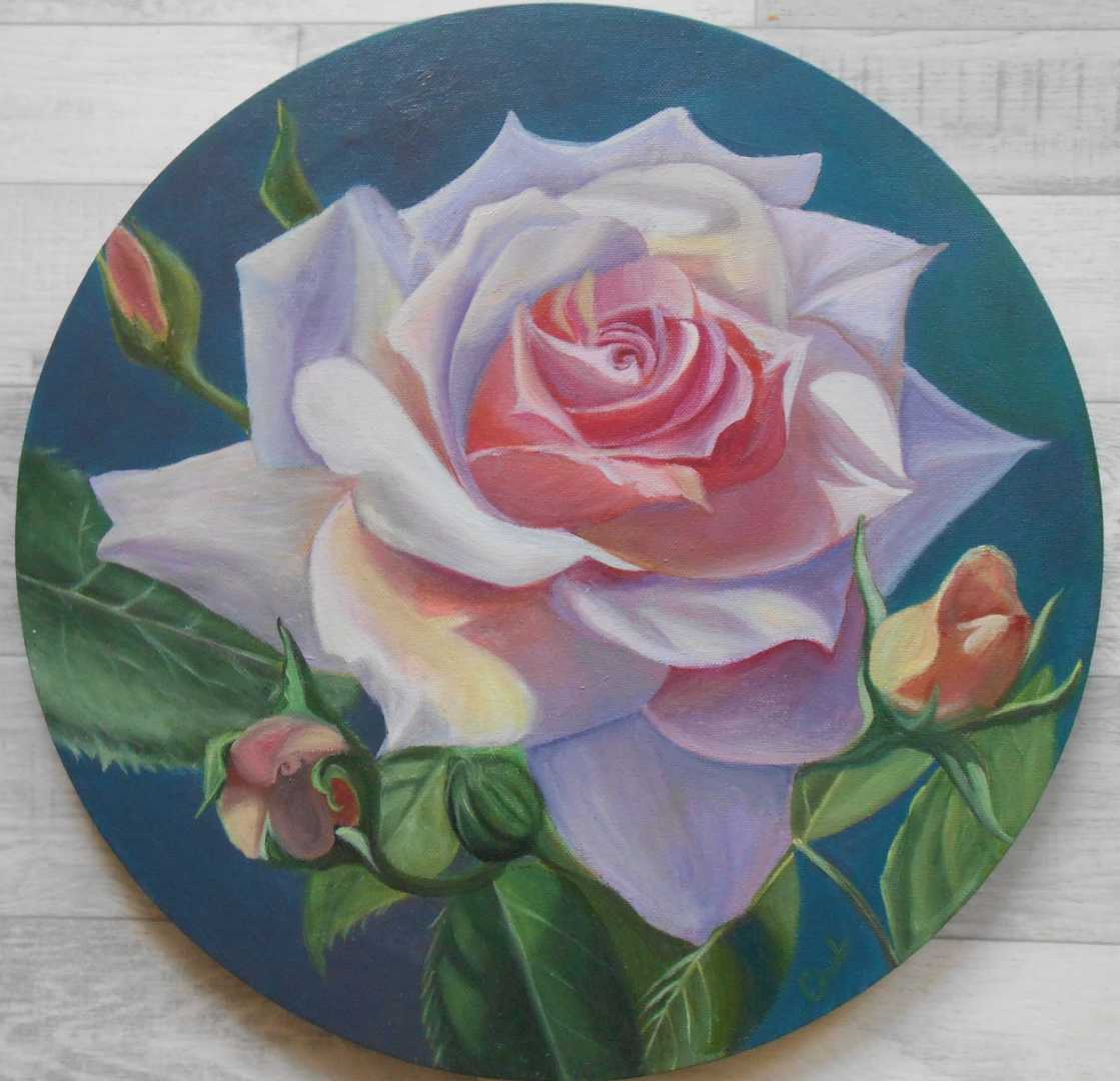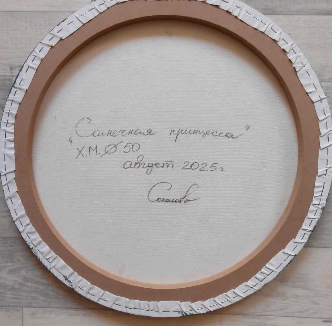 Работа написана в августе 2025 года, выполнена на круглом холсте на подрамнике диаметром 50 см. Картина под названием "Солнечная принцесса" посвящается нежности, безмятежности и чистоте. Картина будет гармонично смотреться в спальне, гостинной, детской. Прекрасный подарок для любимого человека.