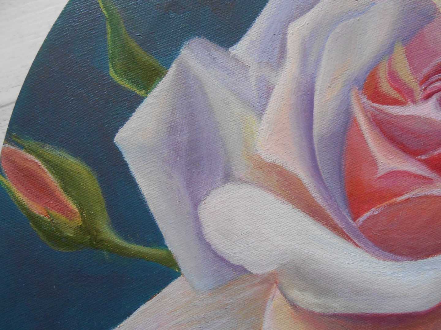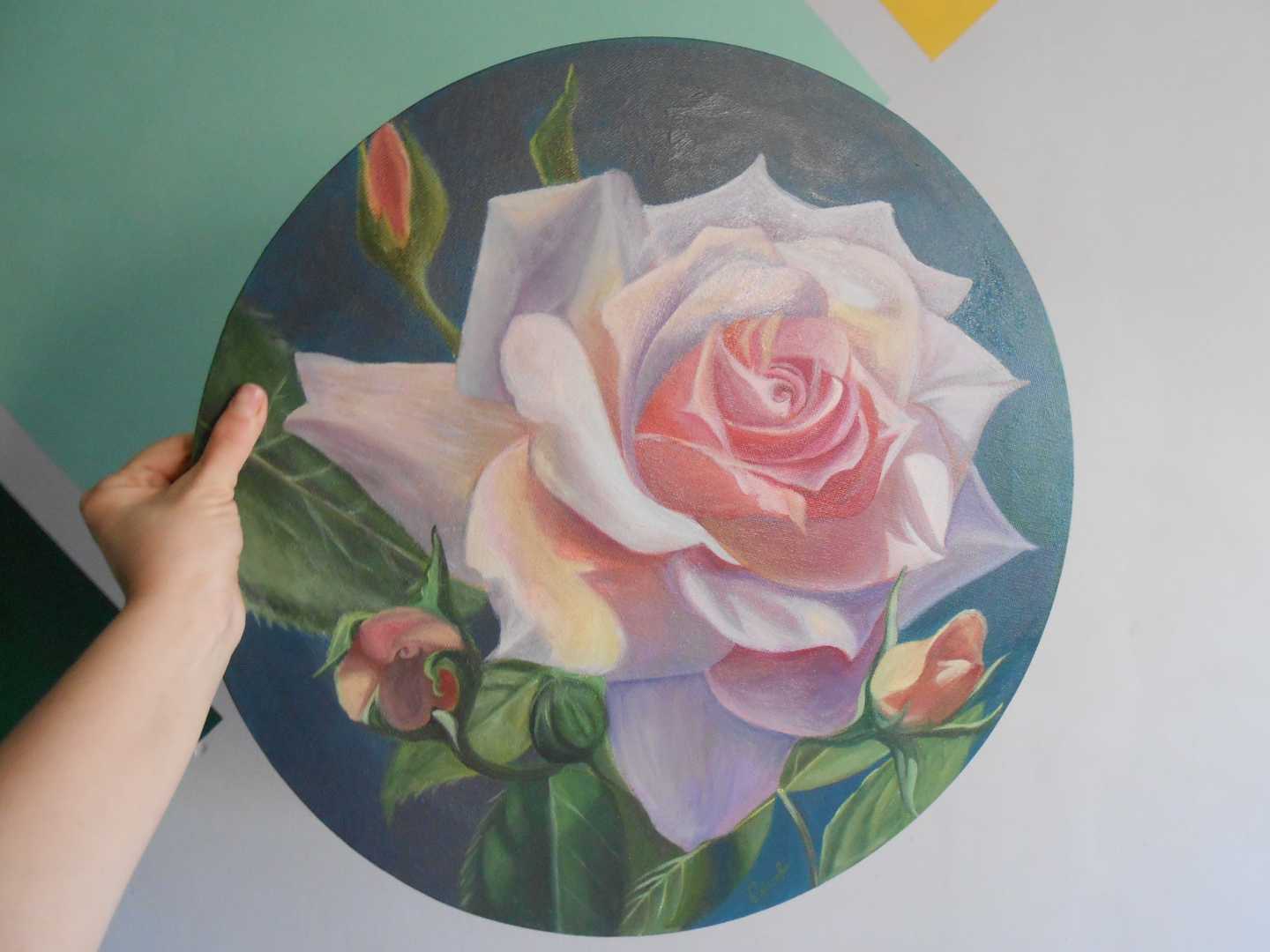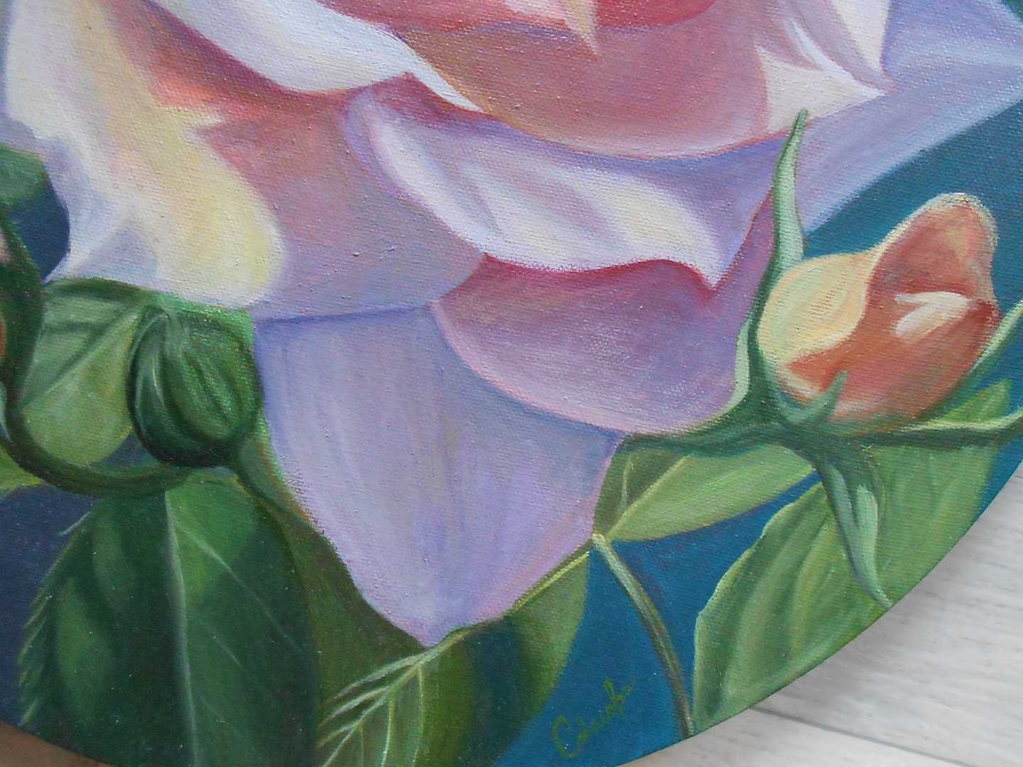 Работа написана в августе 2025 года, выполнена на круглом холсте на подрамнике диаметром 50 см. Картина под названием "Солнечная принцесса" посвящается нежности, безмятежности и чистоте. Картина будет гармонично смотреться в спальне, гостинной, детской. Прекрасный подарок для любимого человека.