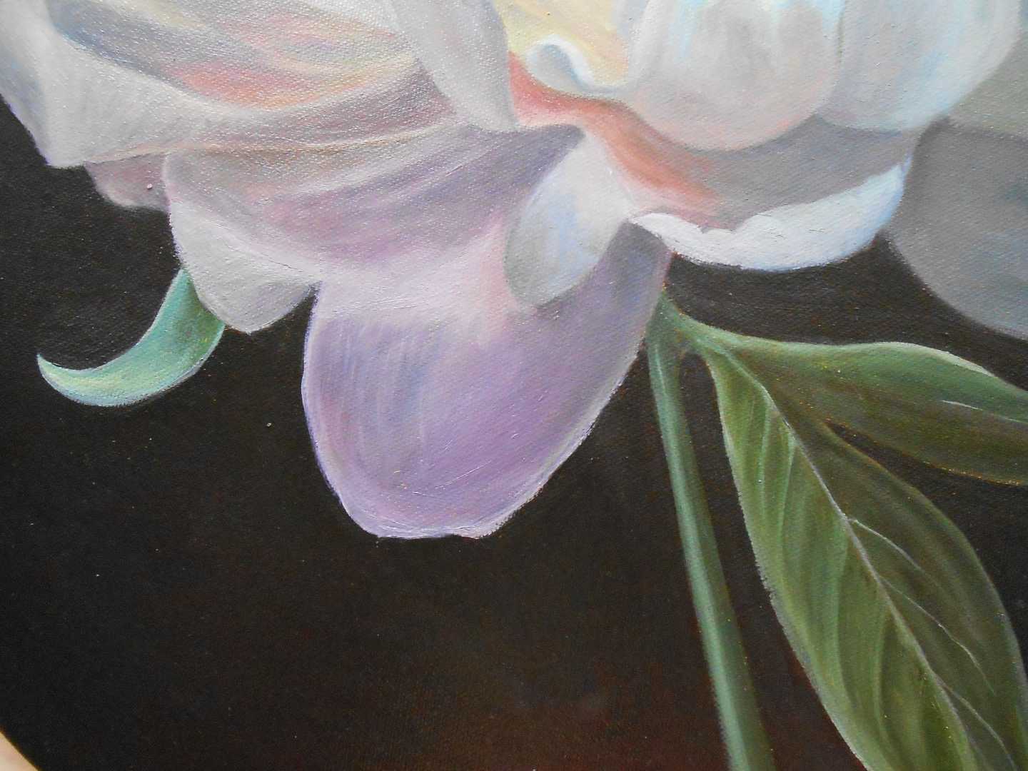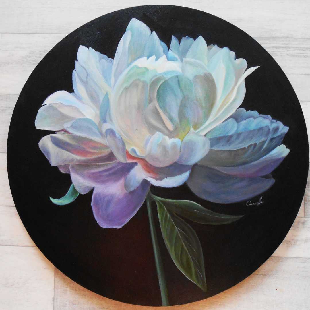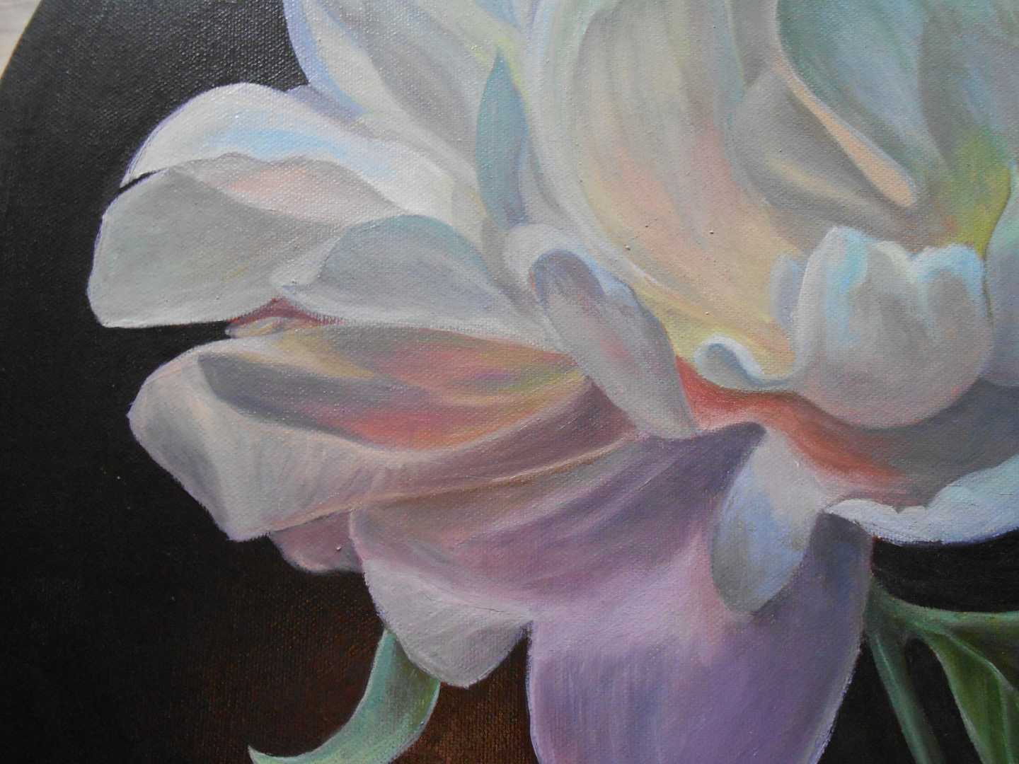 Картина маслом на холсте. Название: "Лунный принц". На картине изображён пион сорта moonstone дословный перевод с англ. лунный камень. Яркий цветок на тёмном фоне, как будто подсвечивается изнутри, символизиря собой нежность, гармонию, грацию, невинность и трепет. В западной культуре белый цвет част