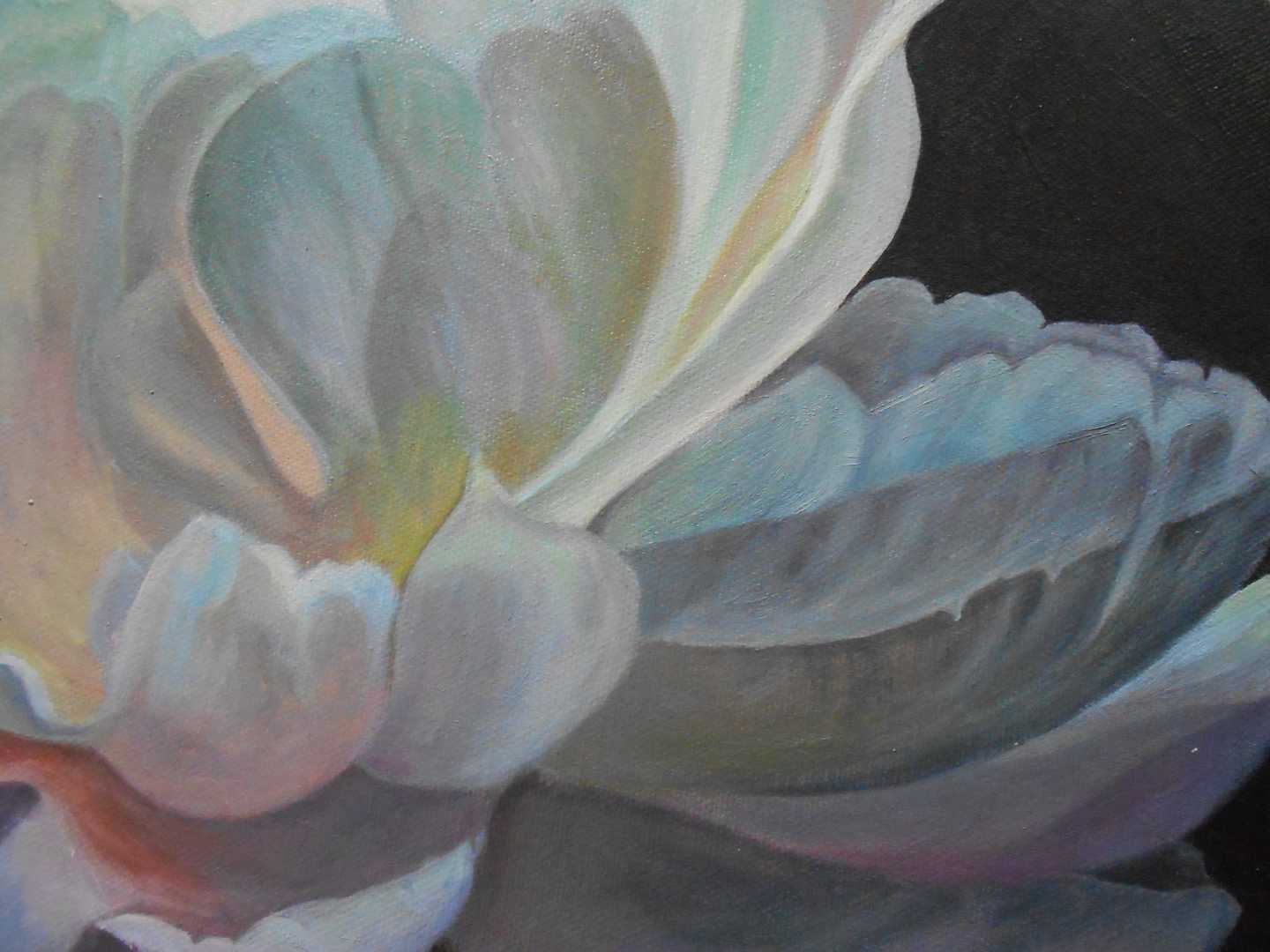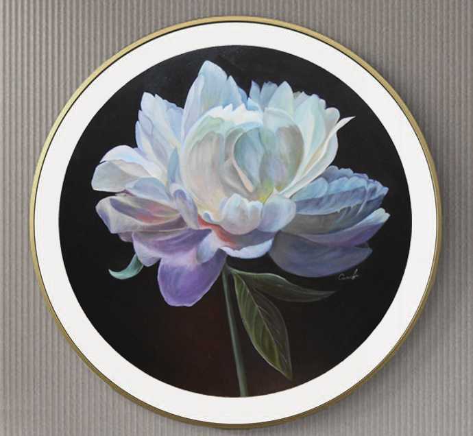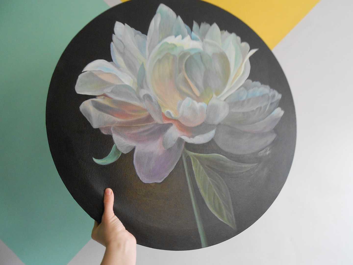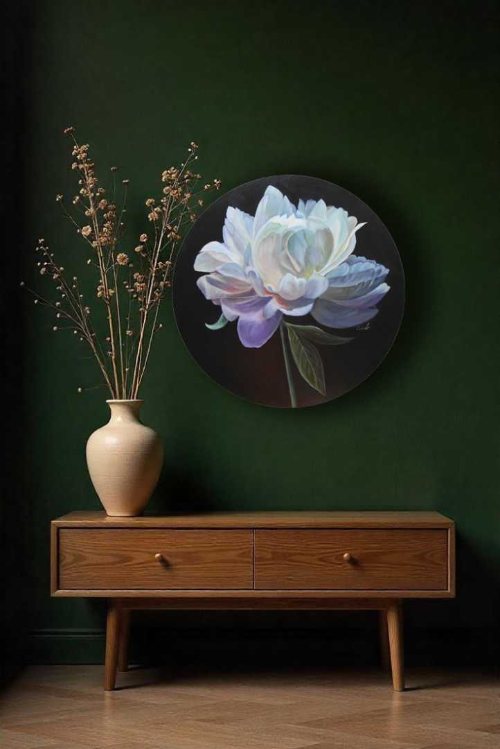 Картина маслом на холсте. Название: "Лунный принц". На картине изображён пион сорта moonstone дословный перевод с англ. лунный камень. Яркий цветок на тёмном фоне, как будто подсвечивается изнутри, символизиря собой нежность, гармонию, грацию, невинность и трепет. В западной культуре белый цвет част