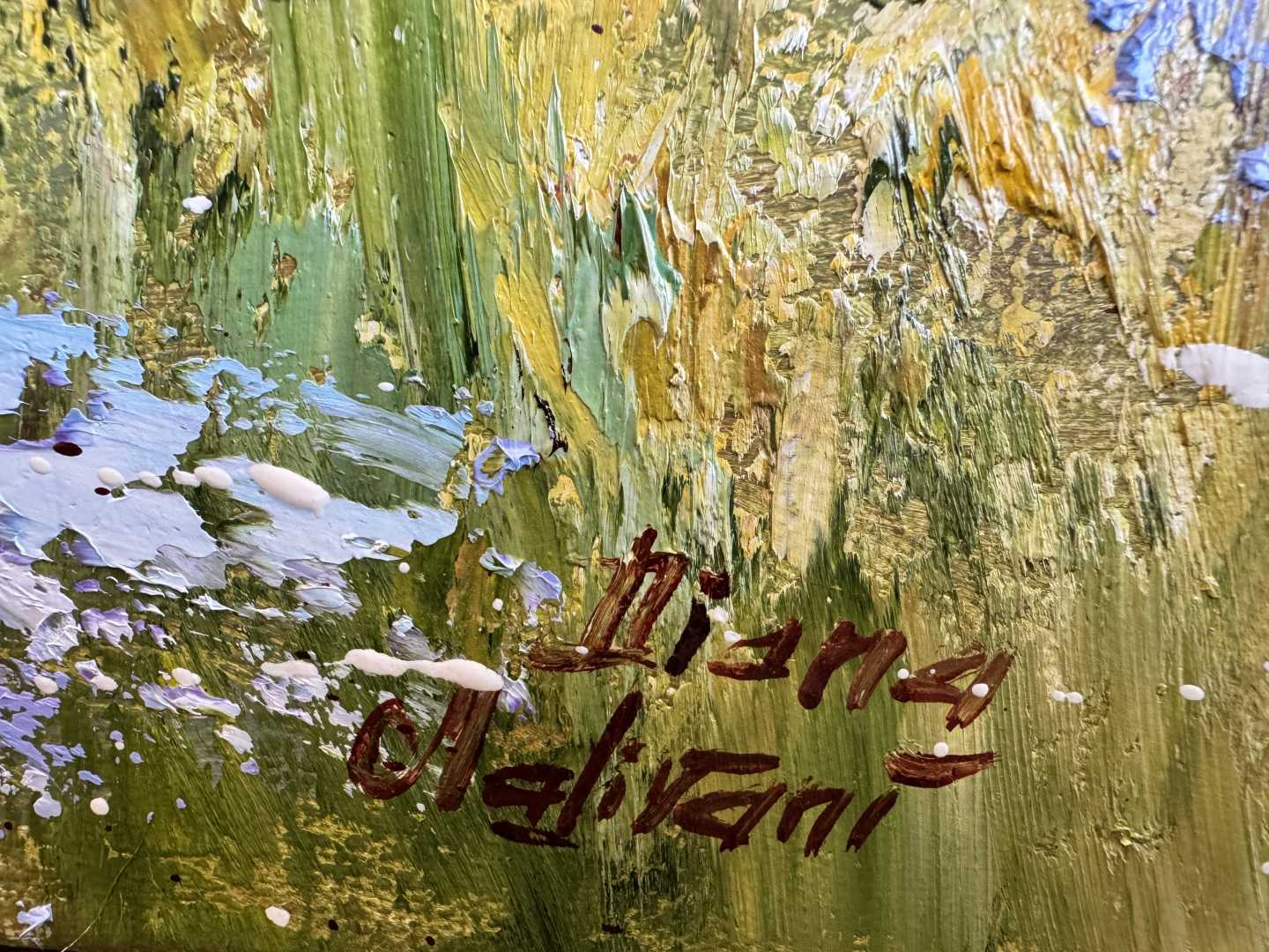 "Что касается пейзажей кисти Дианы Маливани, то влияние Теодора Руссо и французских живописцев-реалистов девятнадцатого века особенно хорошо прослеживается в блистающей массе различных цветов, используемых художником при изображении небосвода. Нежные оттенки розового, голубого и оранжевого разливают