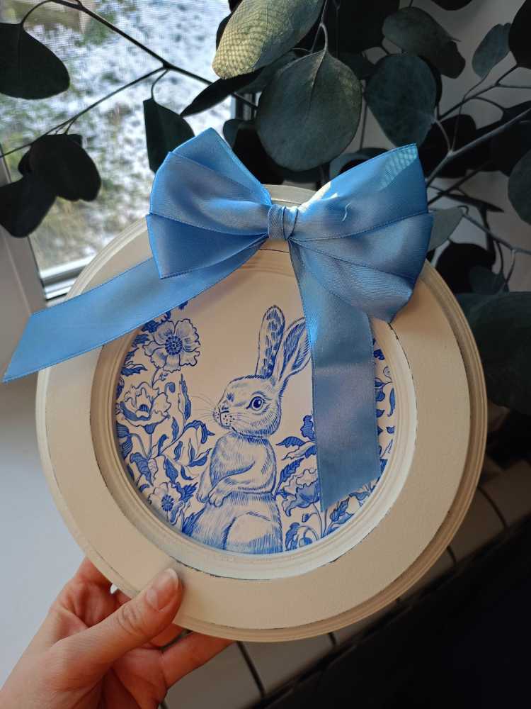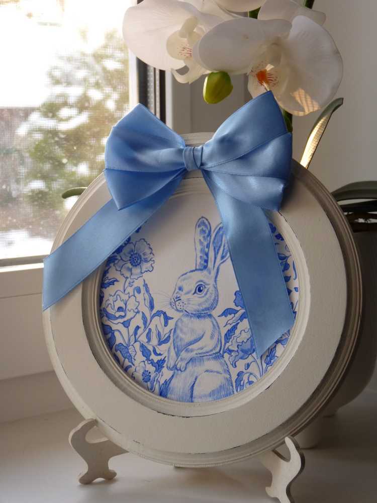 Картина "Весенний кролик" - это изящный акцент в вашем интерьере. Изысканный акварельный рисунок в сине-белых тонах в стиле Туаль-де-Жуи - кролик, сидящий среди орнамента пышных цветов. Работа оформлена в белую раму с лёгкой потертостью, при дающей изделию винтажный шарм. Саму раму украшает атласный