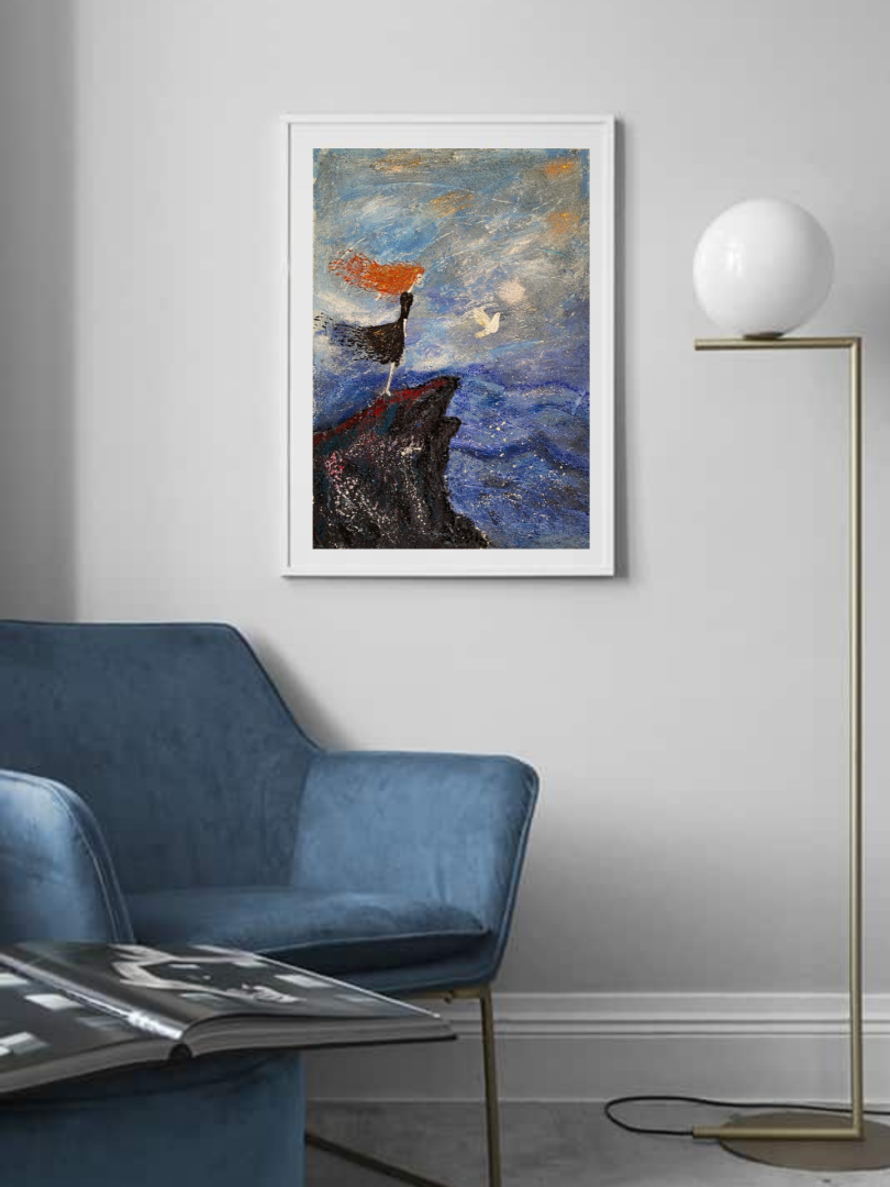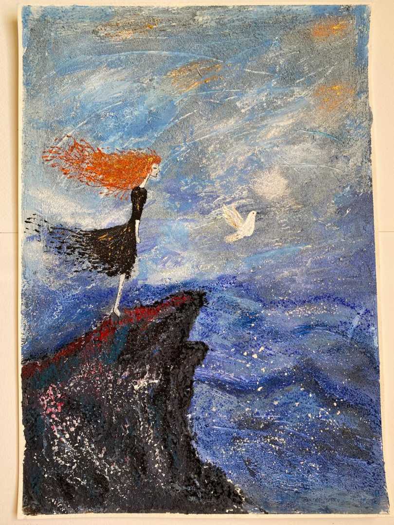 Её чёрное платье растворяется в ветре — символ освобождения, смелости и перехода страха в свободу.