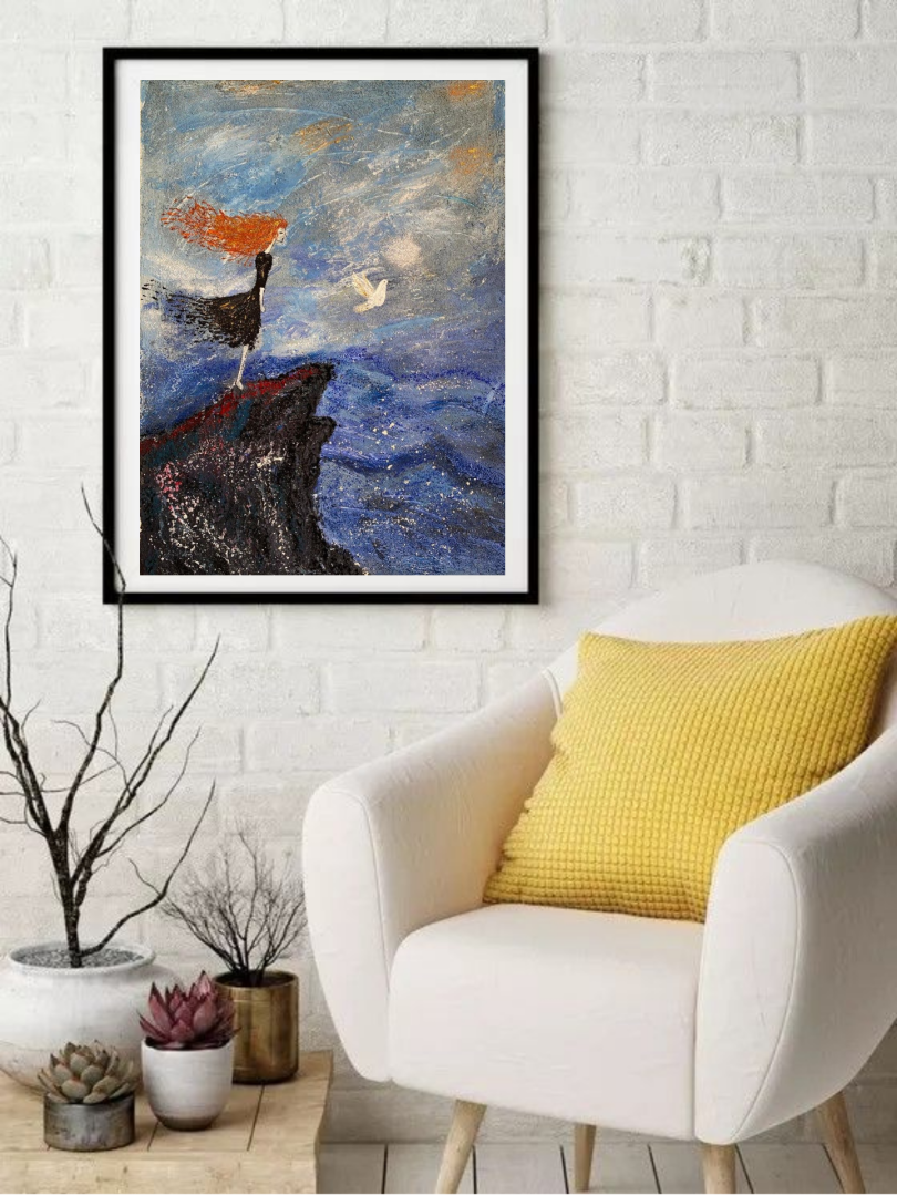 Женщина с огненными волосами стоит на краю скалы, глядя в бескрайнее небо.