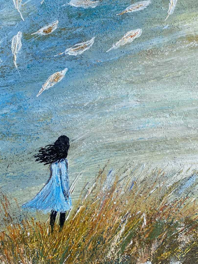 Фактурные слои акрила, пастели и текстурной пасты создают воздушную, почти сновидческую поверхнос