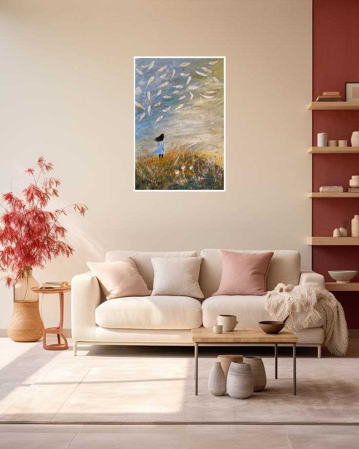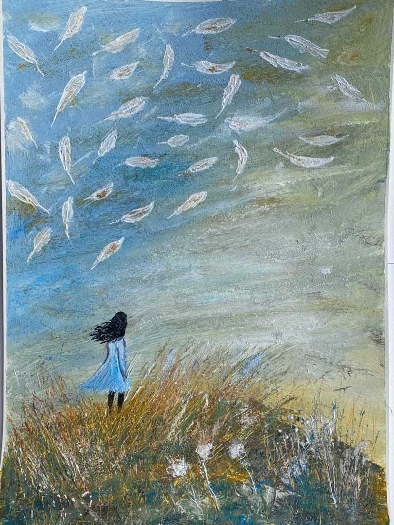 Девушка стоит среди высокой травы, наблюдая, как ветер уносит лёгкие перья.
