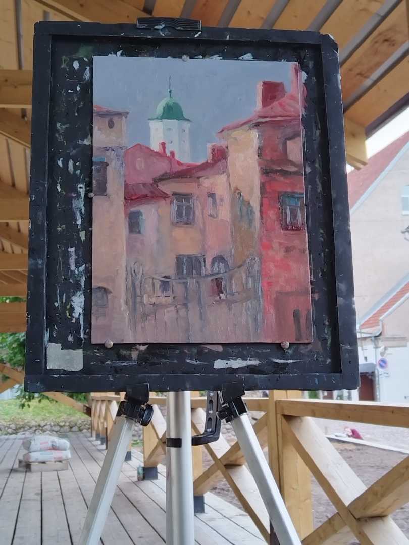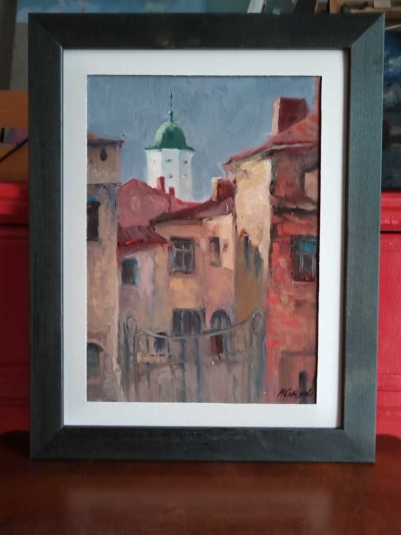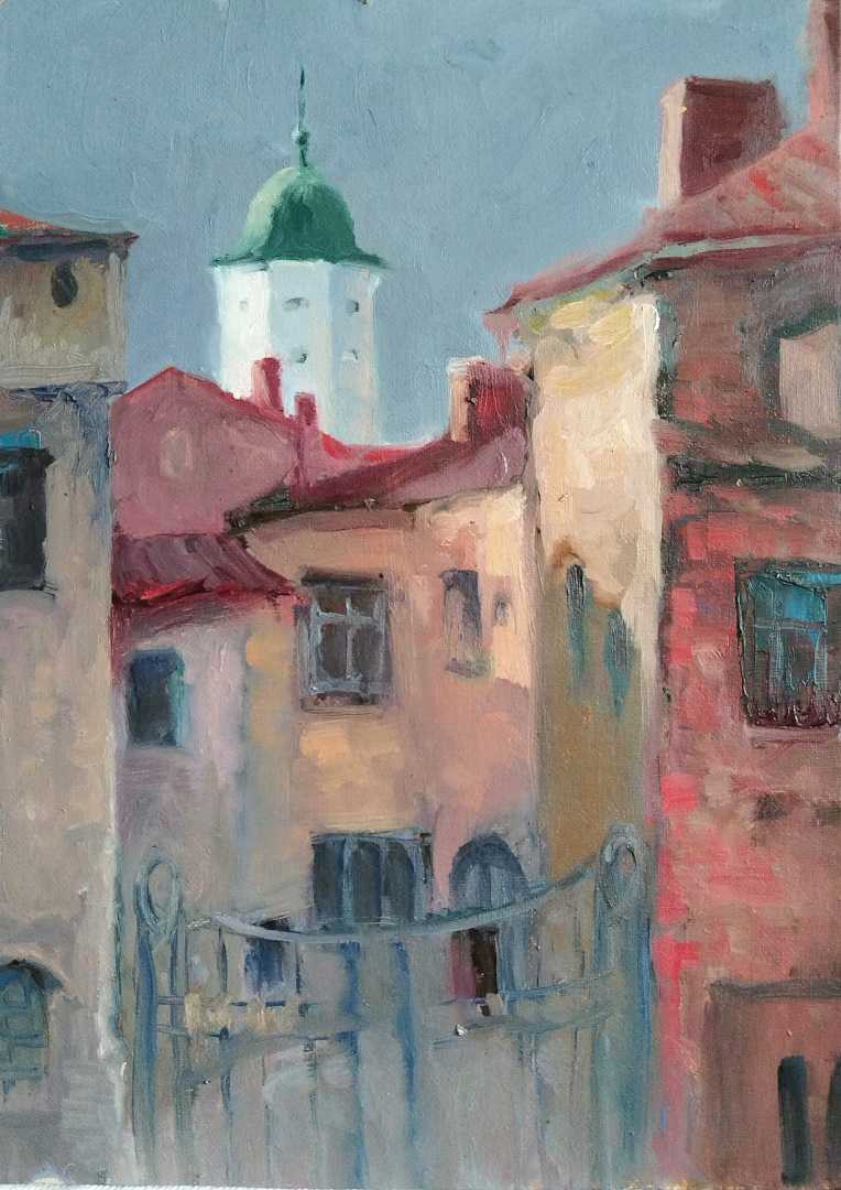 Небольшой этюд с натуры, написанный в Выборге, передаёт атмосферу старого северного города: мягкие тона домов, красные крыши, узкие улочки и узнаваемая башня с зелёным куполом. Живописная манера пленэра сохраняет свежесть момента и лёгкость воздуха. Картина станет акцентом в интерьере и добавит ощущ