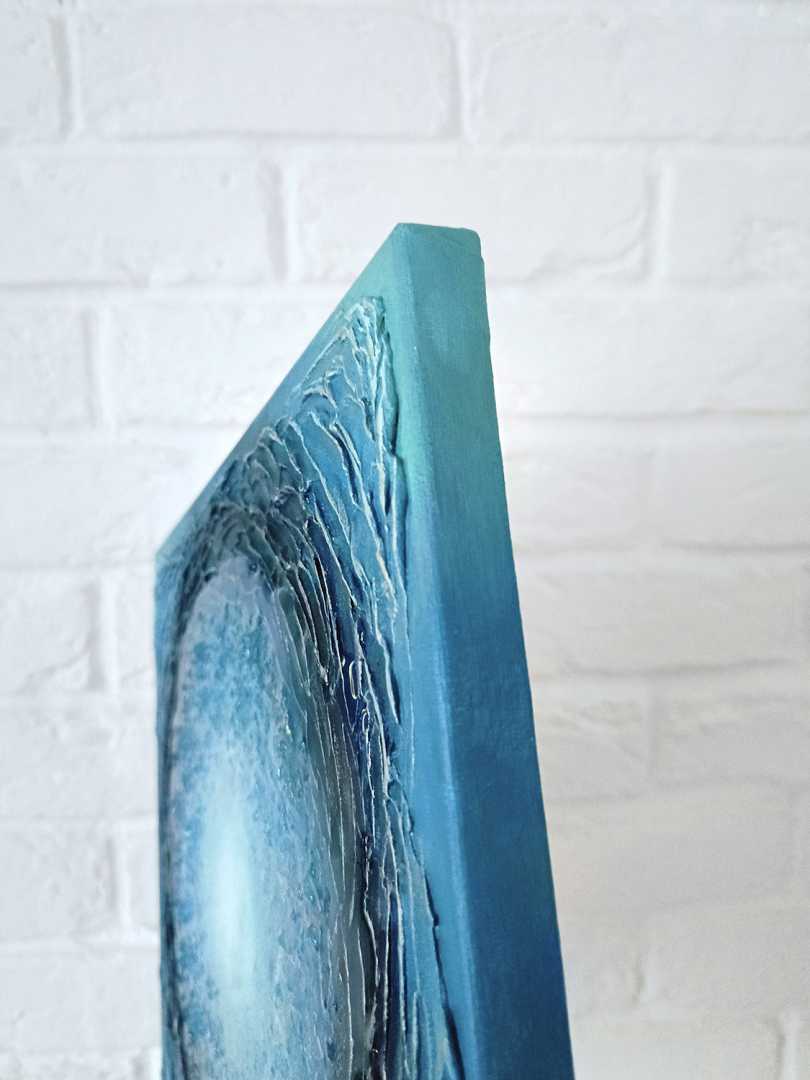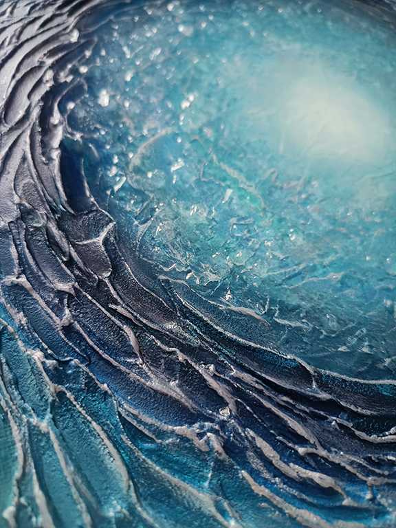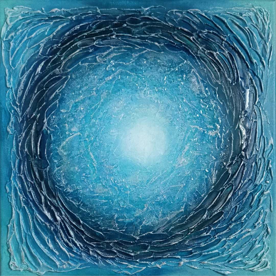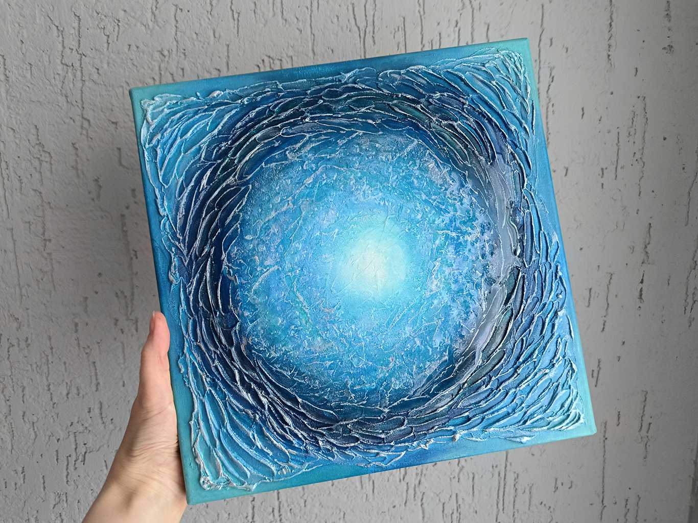 Картина описывает ощущение погружения в водный мир. В центре – источник света снаружи, который просматривается сквозь воду. Фактурная поверхность работы создает эффект живого пространства, наполненного энергией и тайной. «Взгляд из глубины» – это приглашение задуматься о неизведанных слоях собственн