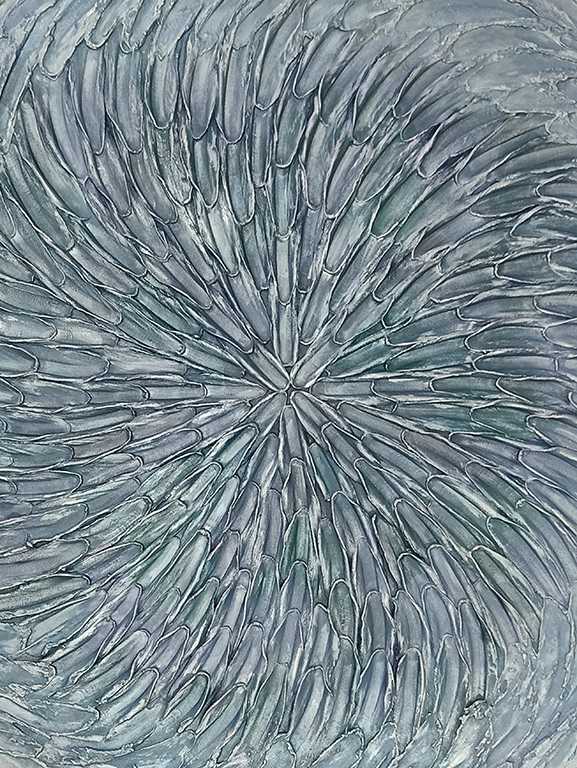 Картина воплощает в себе динамичный вихрь энергии. Мазки напоминают крылья птиц, кружащихся в танце. Холодные оттенки голубого, серого и зеленого создают ощущение свежести и воздуха, словно запечатлевая мгновение взлета.
