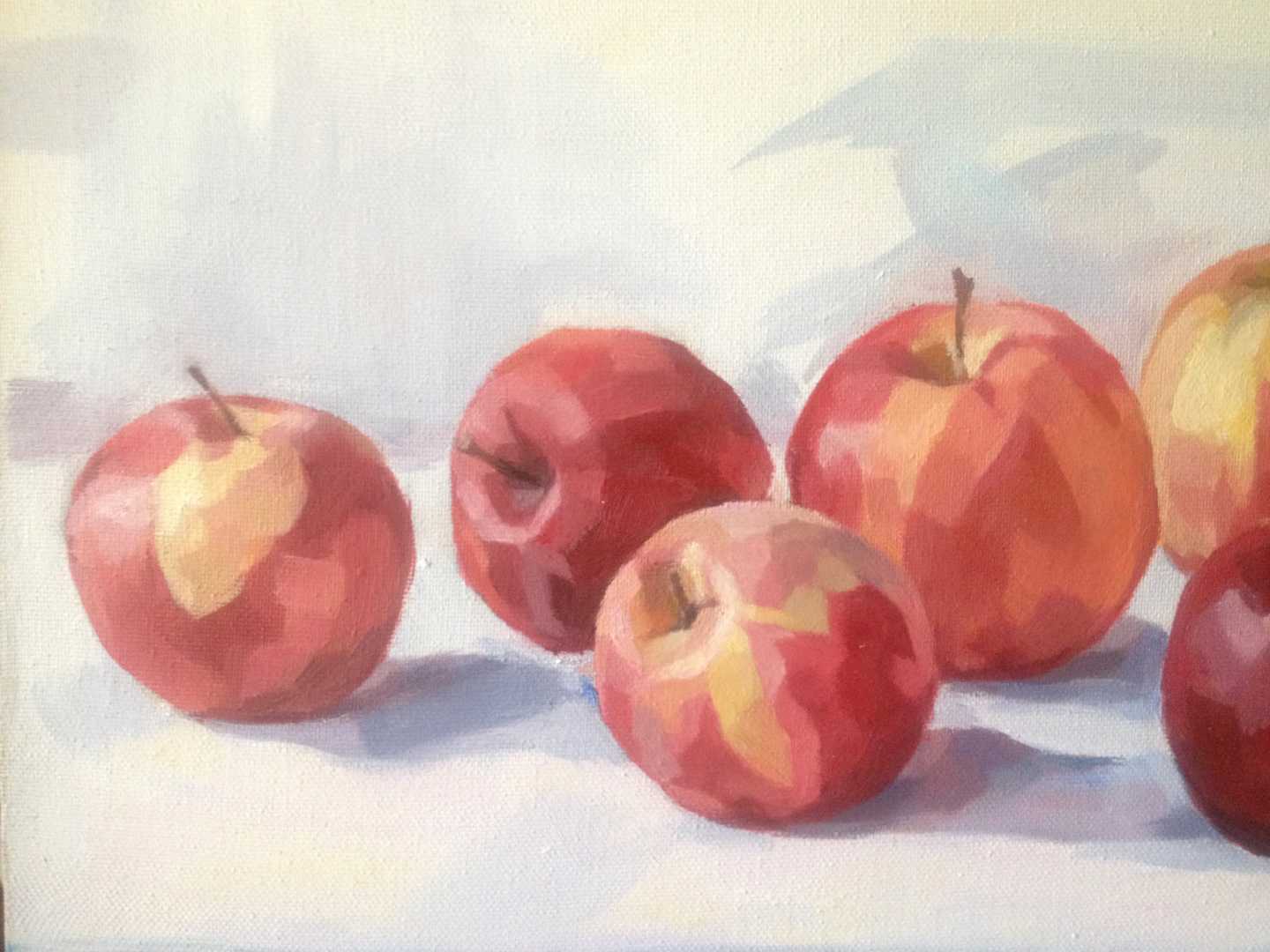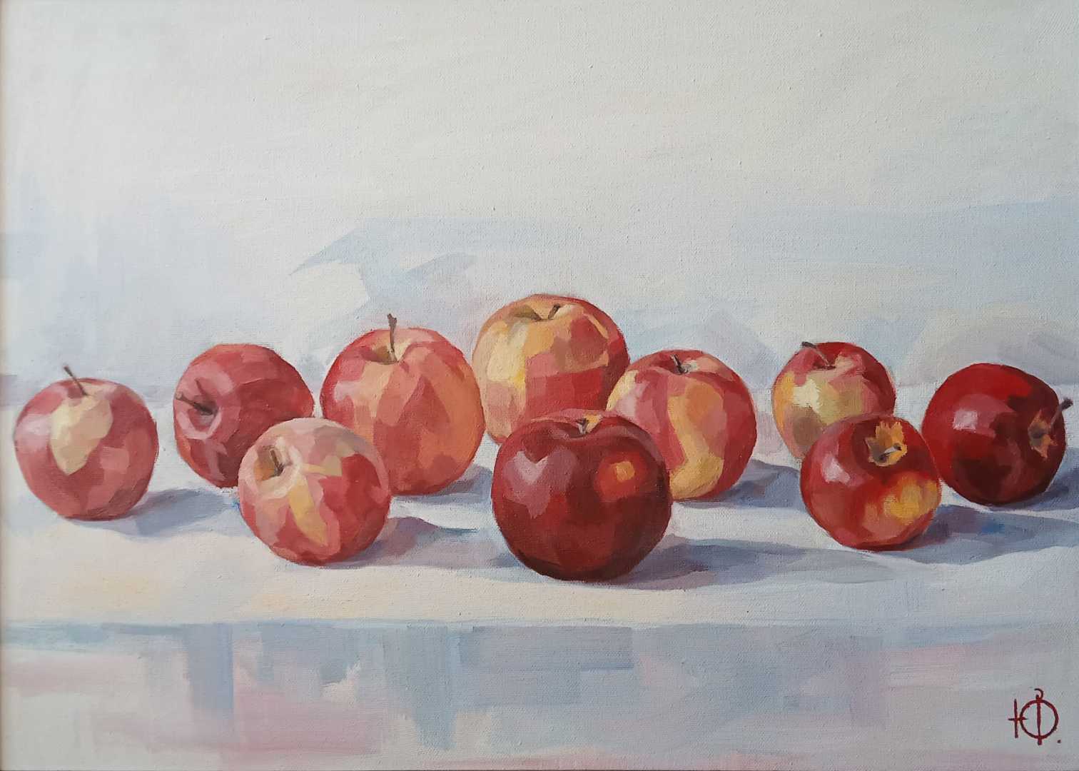 Картина натюрморт, горизонтальная, разбросанные яблоки на белом фоне.