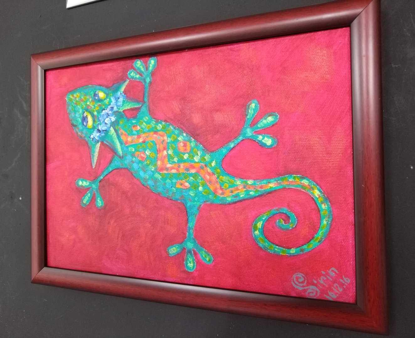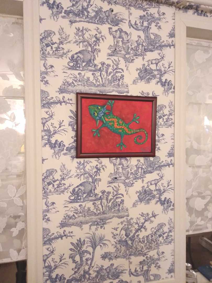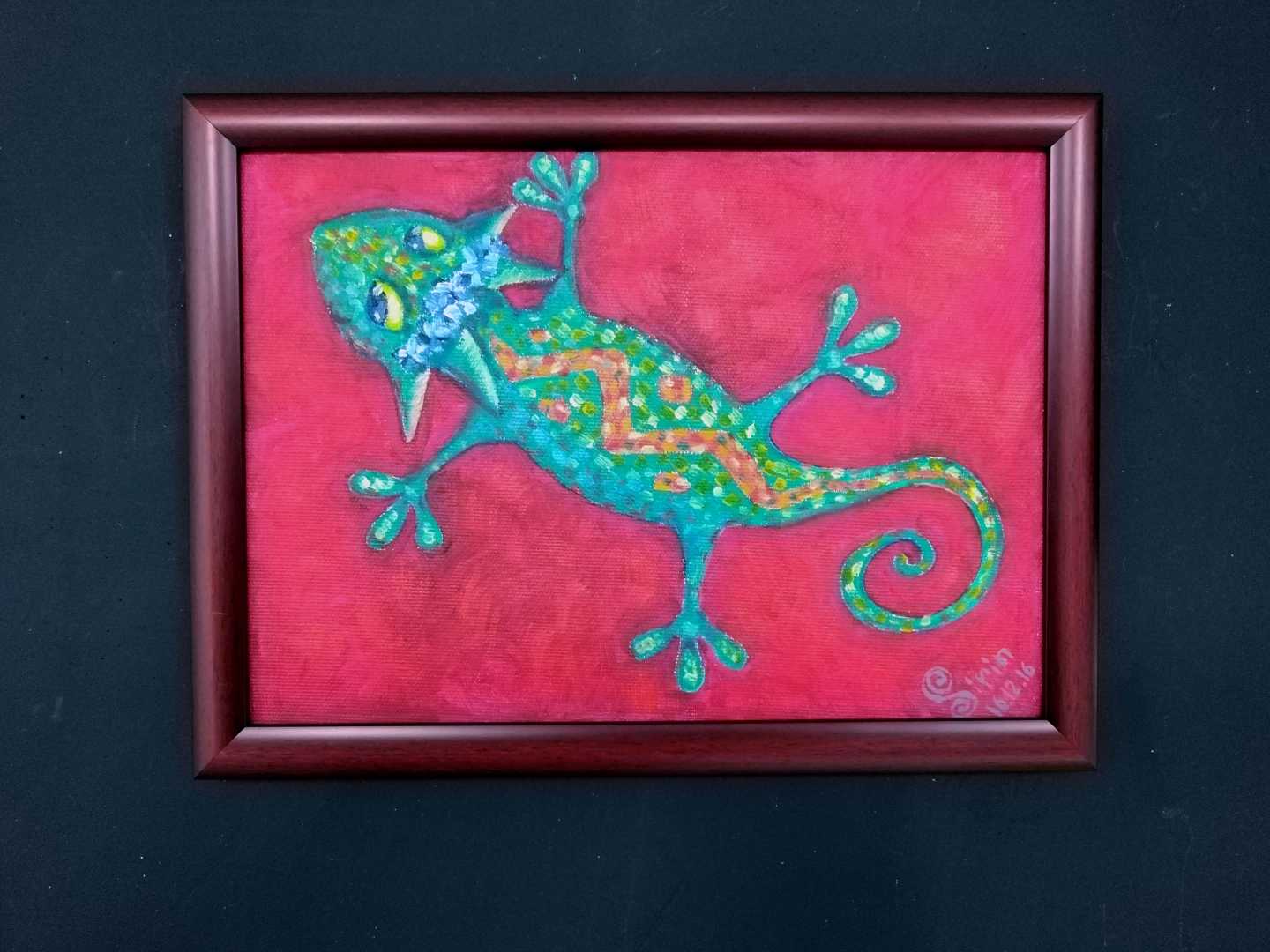 В 2016 году на "Минерал Шоу" я познакомилась с продавцом из Конго, который подарил мне малахитовые бусины, из которых я потом сделала красивые серьги. Вдохновлённая этой дружбой, я создала образ ящерки — зелёного хамелеона с африканским узором и голубым венк