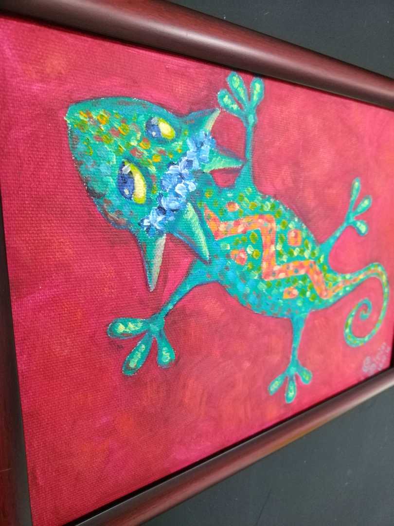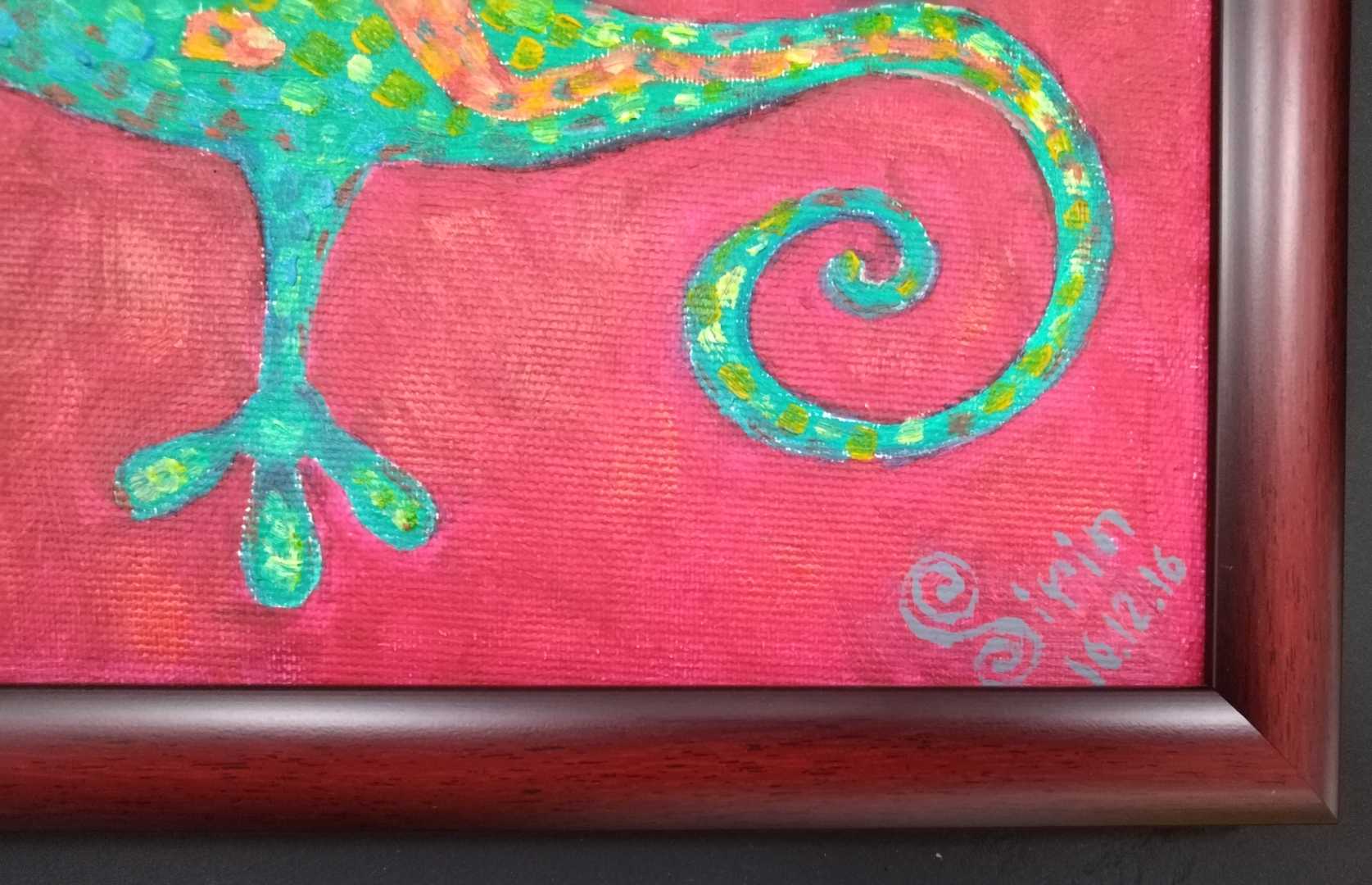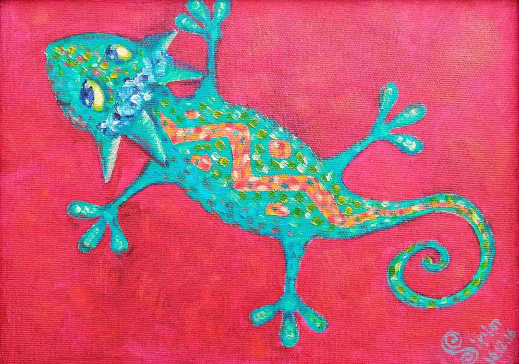В 2016 году на "Минерал Шоу" я познакомилась с продавцом из Конго, который подарил мне малахитовые бусины, из которых я потом сделала красивые серьги. Вдохновлённая этой дружбой, я создала образ ящерки — зелёного хамелеона с африканским узором и голубым венк