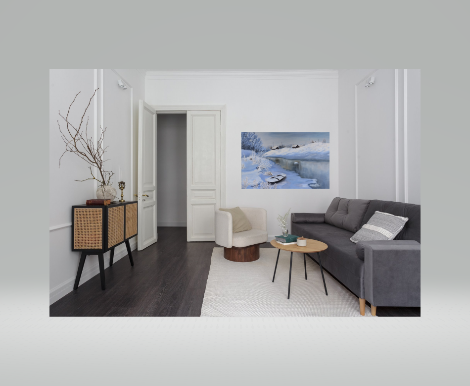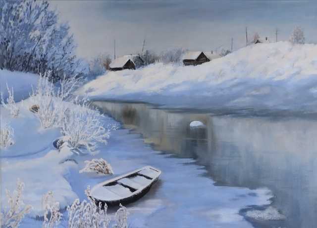 На картине изображена удивительная зимняя картина, которая переносит нас в мир тишины и спокойствия. Половина замершей реки напоминает о преходящей природной красоте и непредсказуемости зимних элементов. Снег, покрывающий берега и кустарники, напоминает о чистоте и невинности природы, оставив свои с