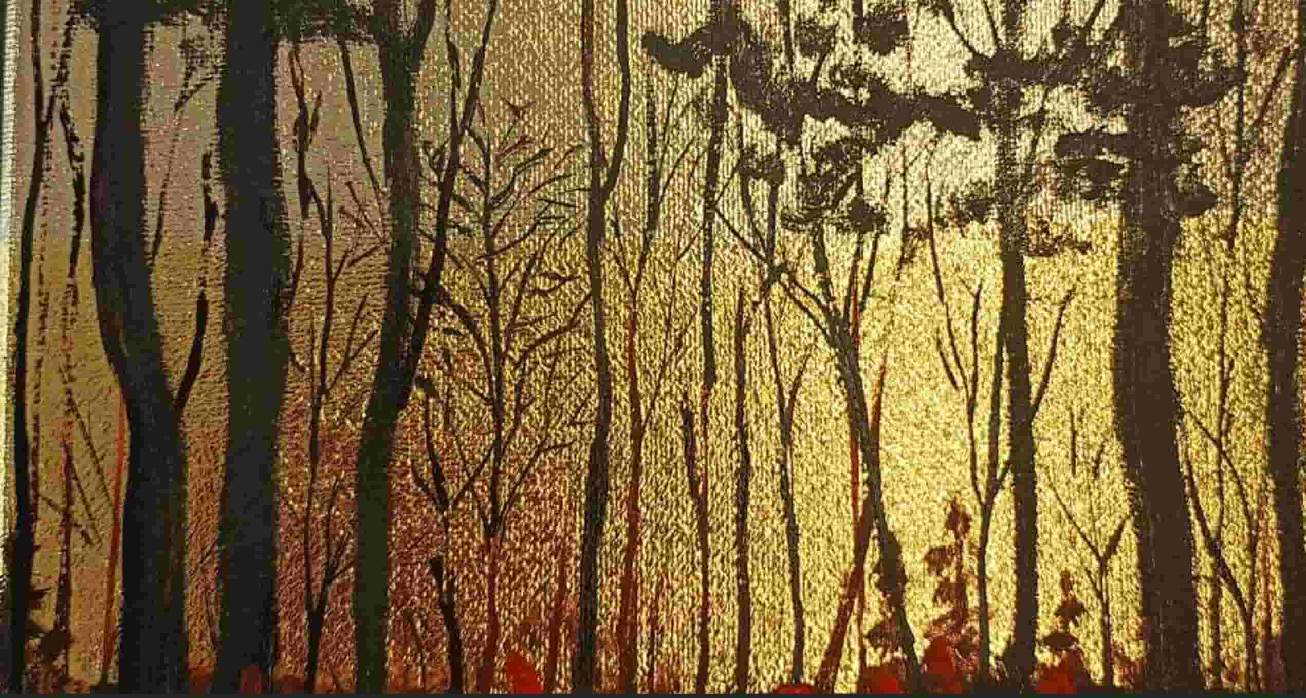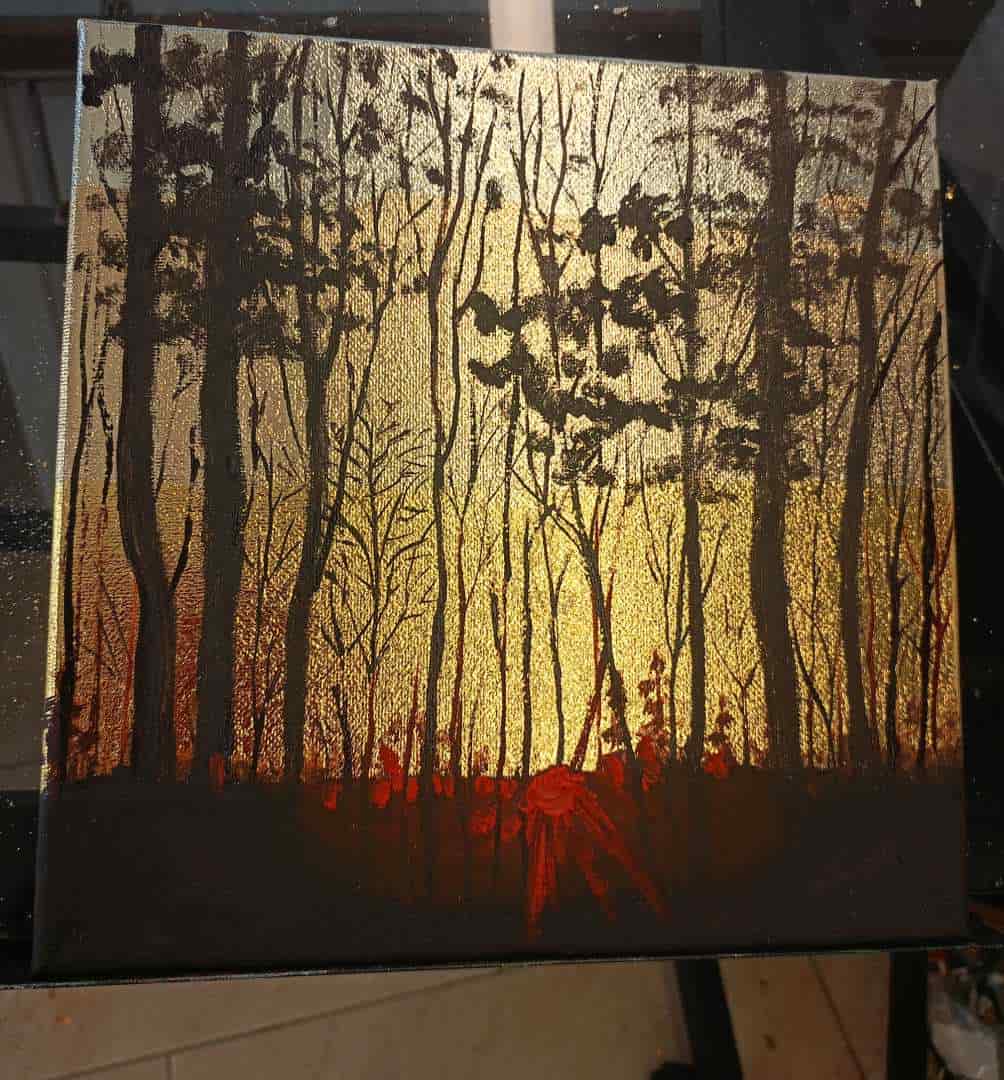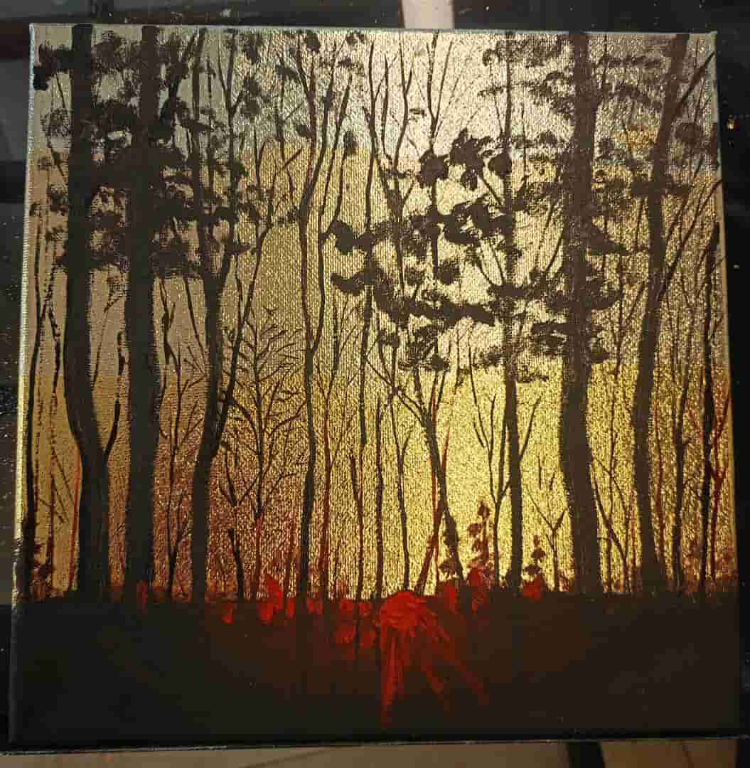 Работа "Закат в чаще леса", размерами 25х25 см. выполнена с использованием масла и потали, защищена художественным лаком.
