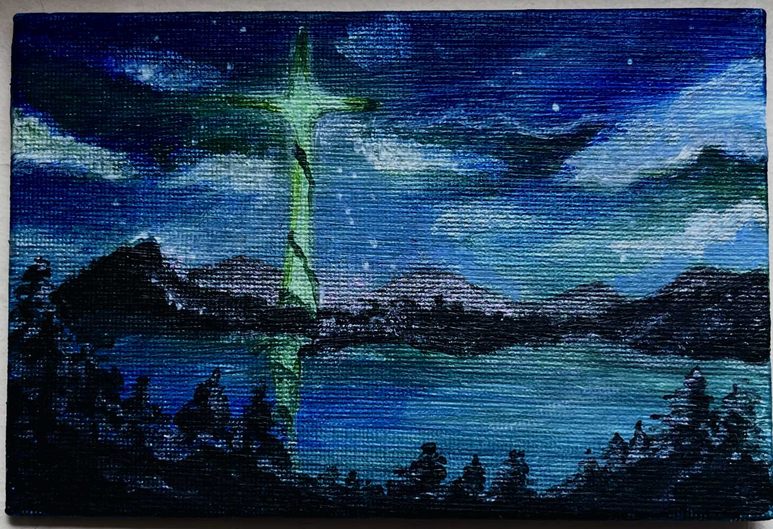 Миниатюра «Свет над горами» — атмосферная акриловая работа, передающая ощущение таинственного ночного пространства.