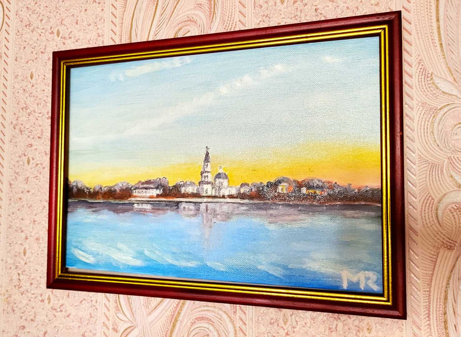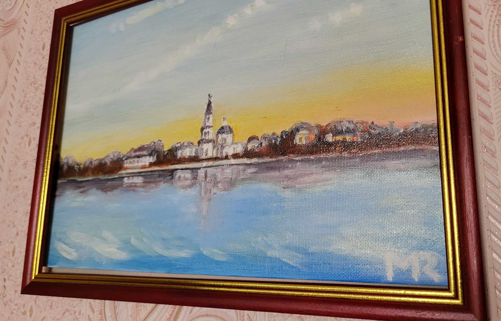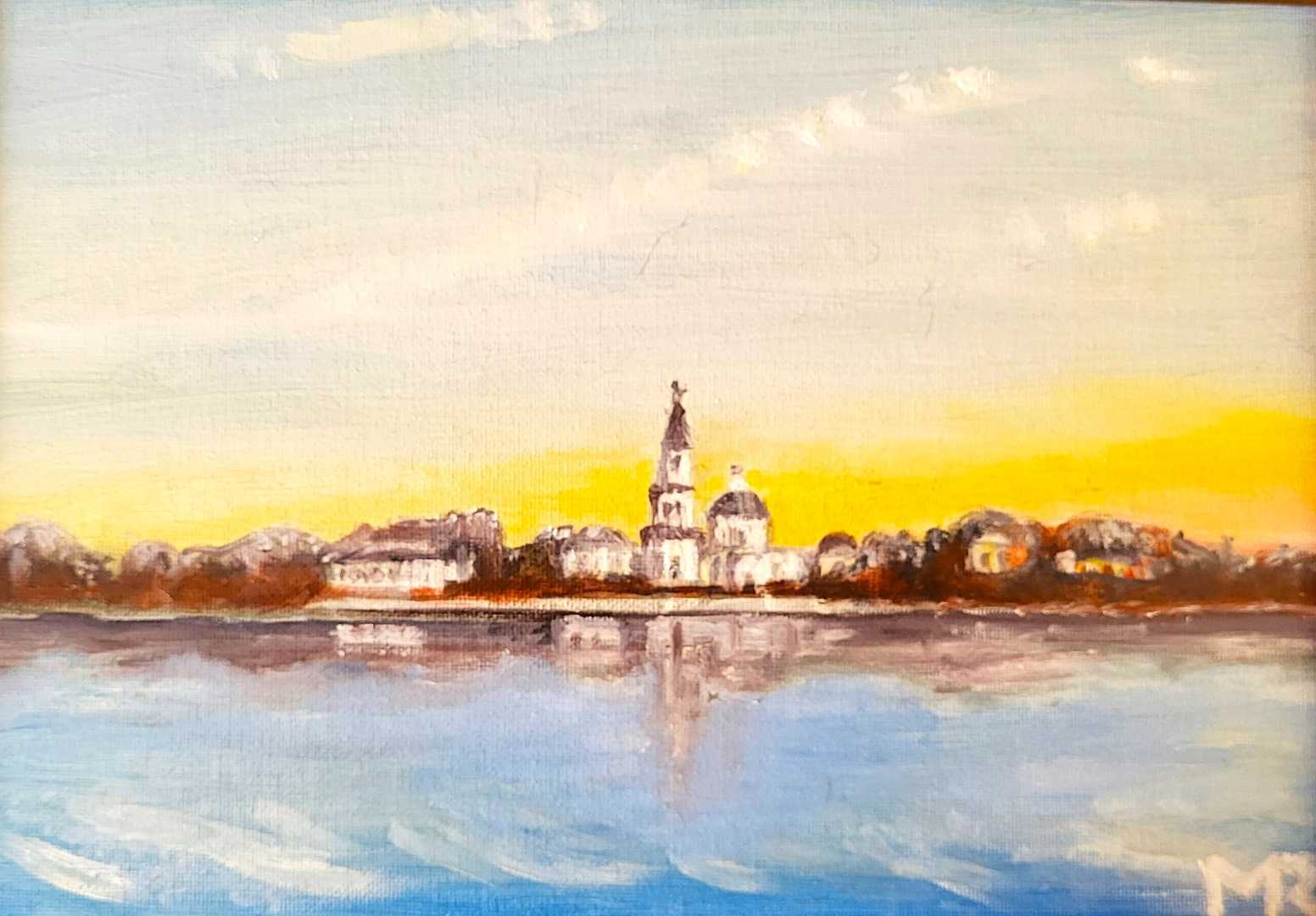 Городской пейзаж с рекой, покрытой первым льдом. Тверь, вид на Волгу и Екатерининский монастырь. Масло, холст на картоне, размер 30х20 см.