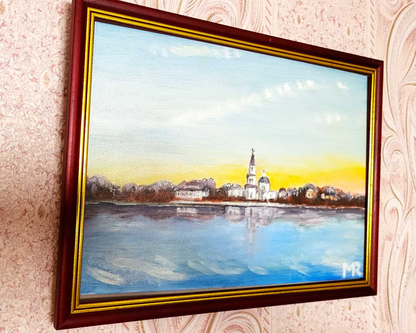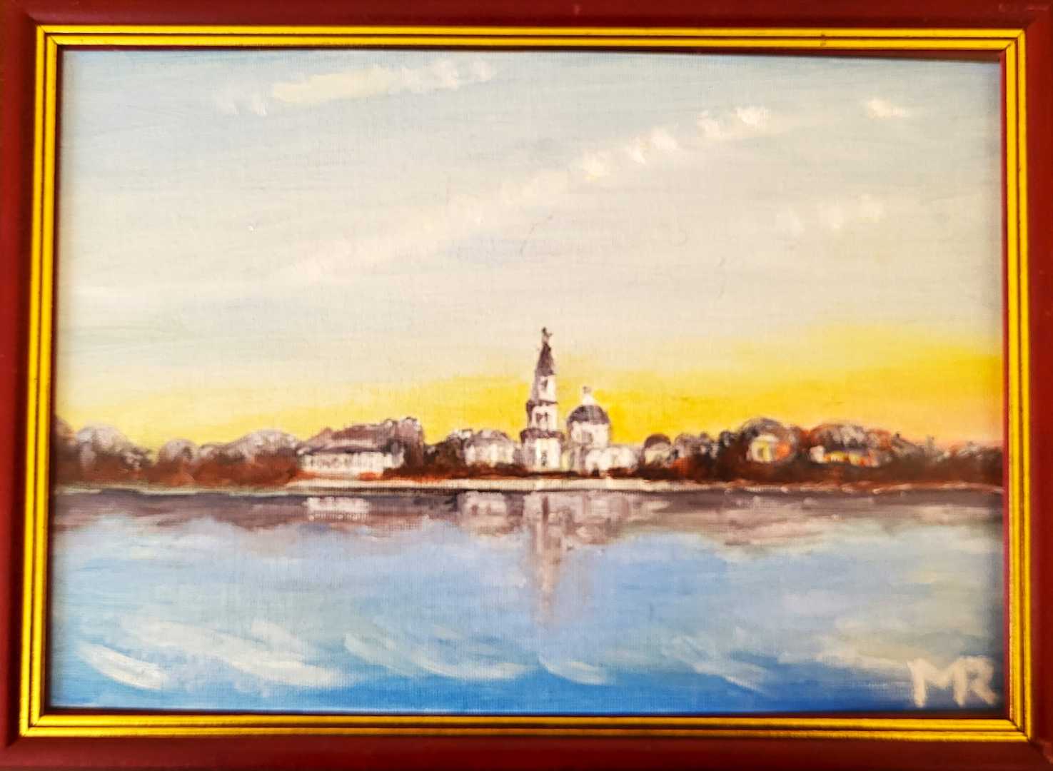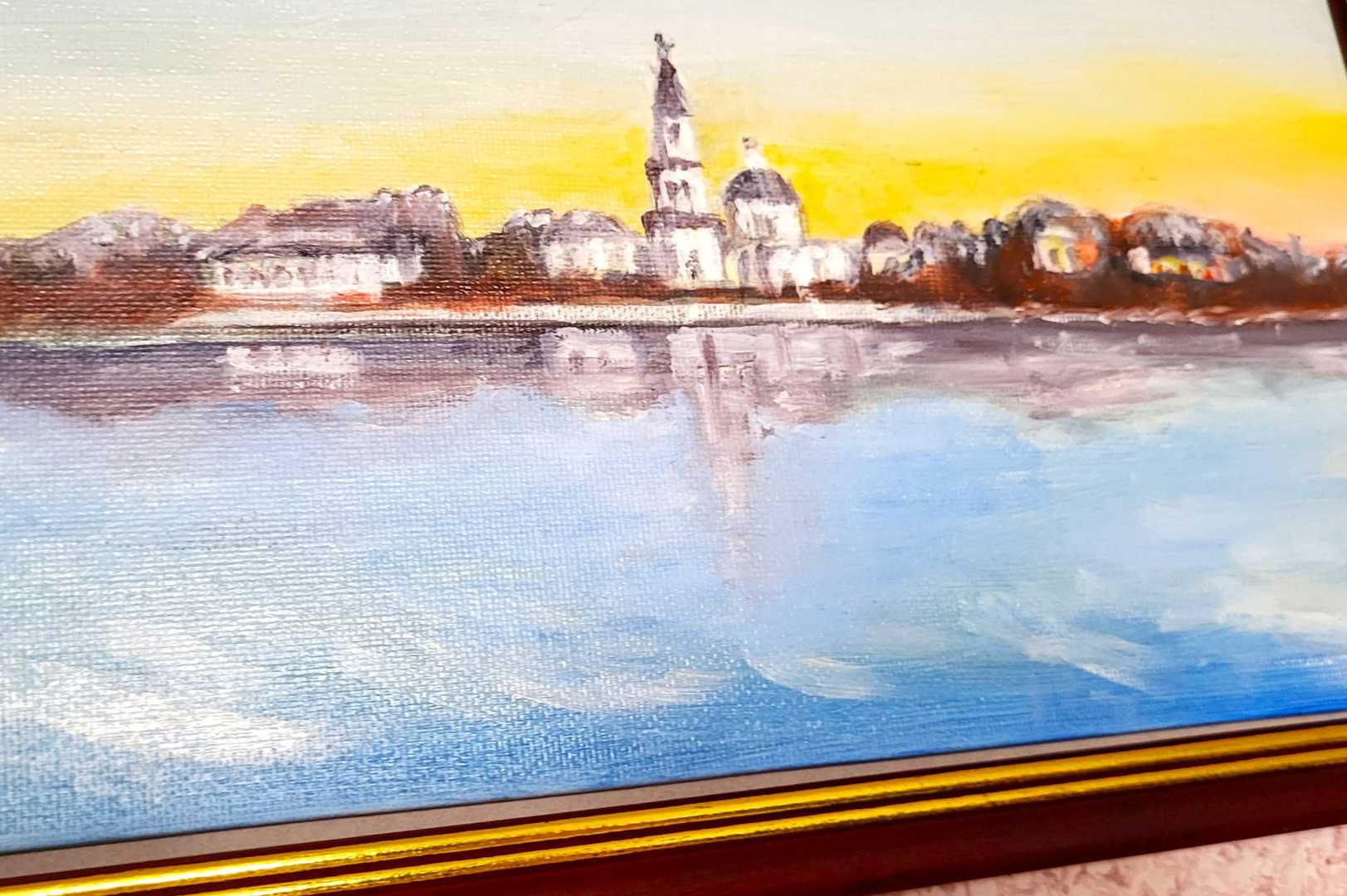 Городской пейзаж с рекой, покрытой первым льдом. Тверь, вид на Волгу и Екатерининский монастырь. Масло, холст на картоне, размер 30х20 см.