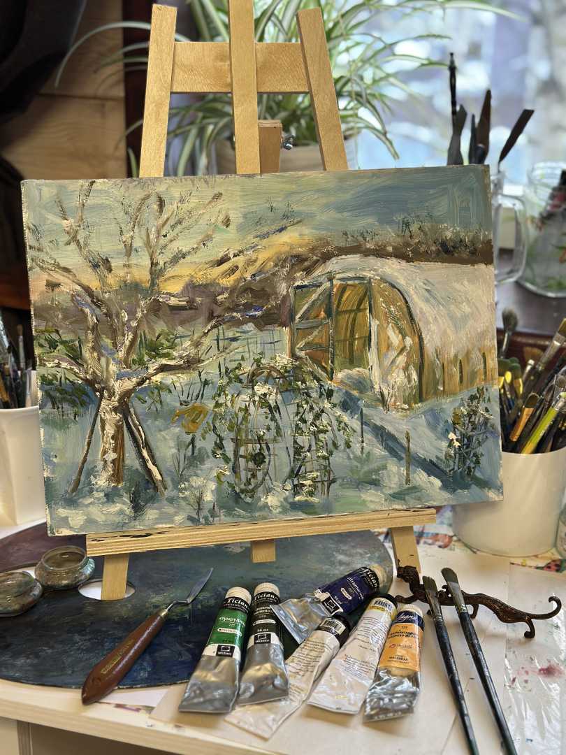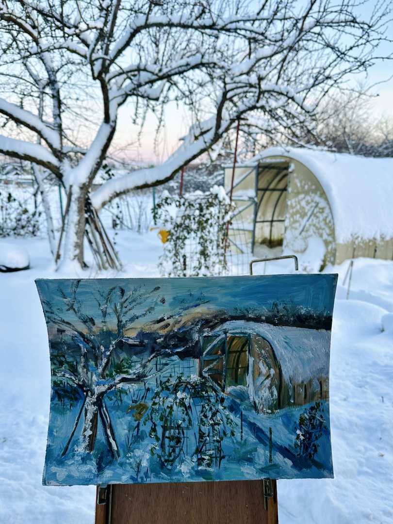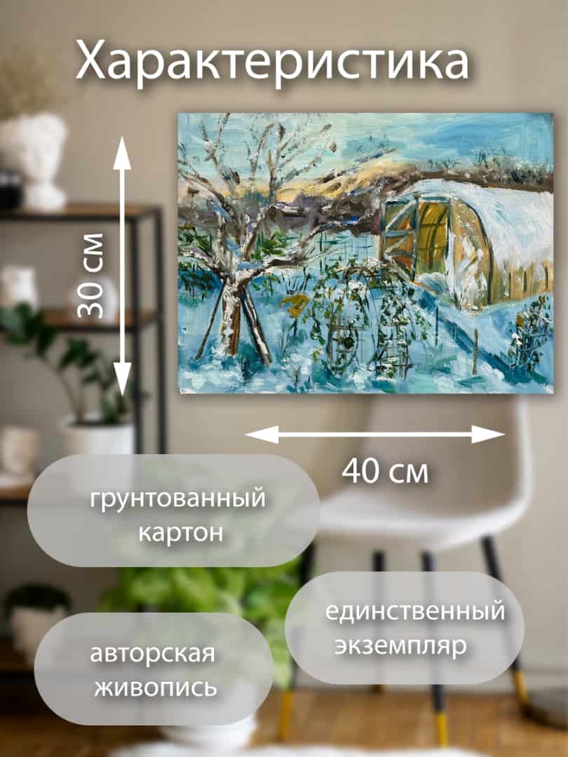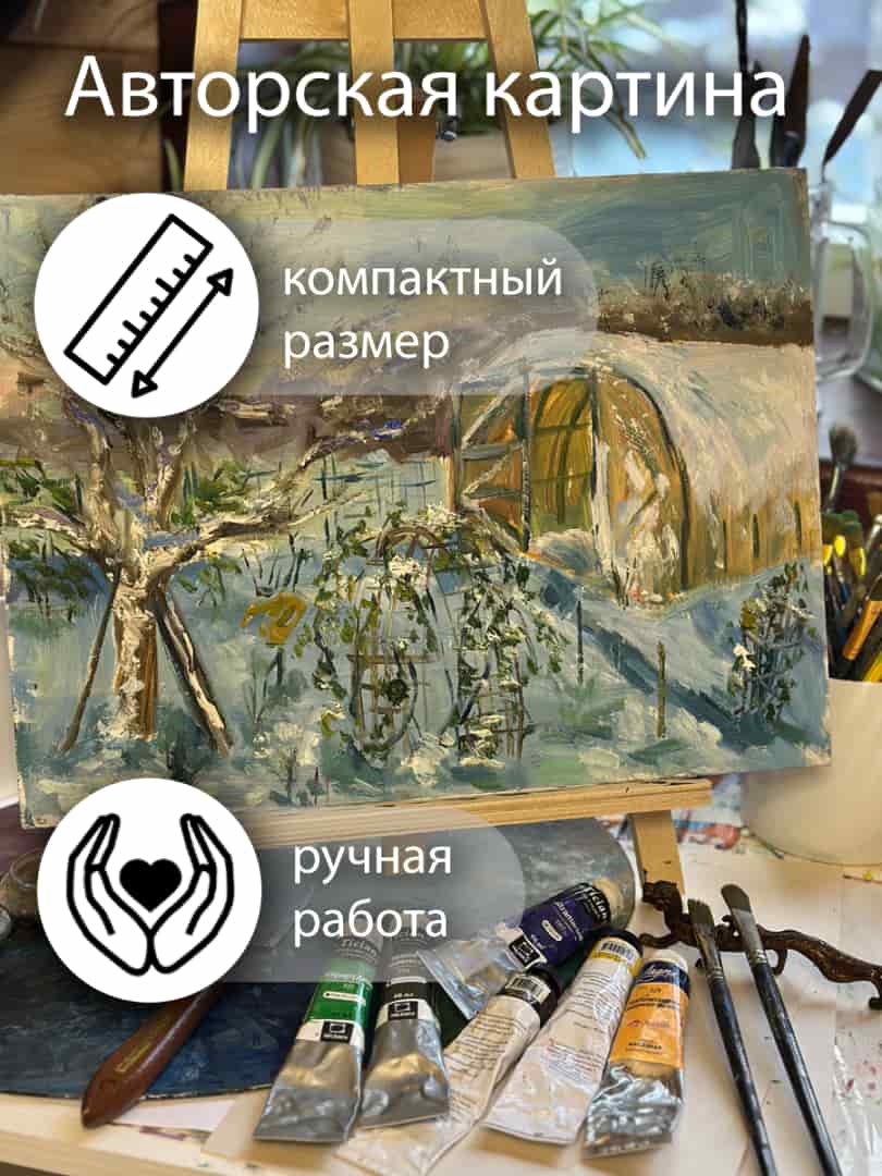На полотне — наш любимый зимний сад. Спящая под снегом теплица, склонившая ветки роза и застывшая в инее груша. Это пейзаж о тепле дома, о надежде и о том, как красиво природа отдыхает в ожидании новой весны. Идеальный подарок для заядлых дачников и тех, кто ценит эстетику русской зимы.