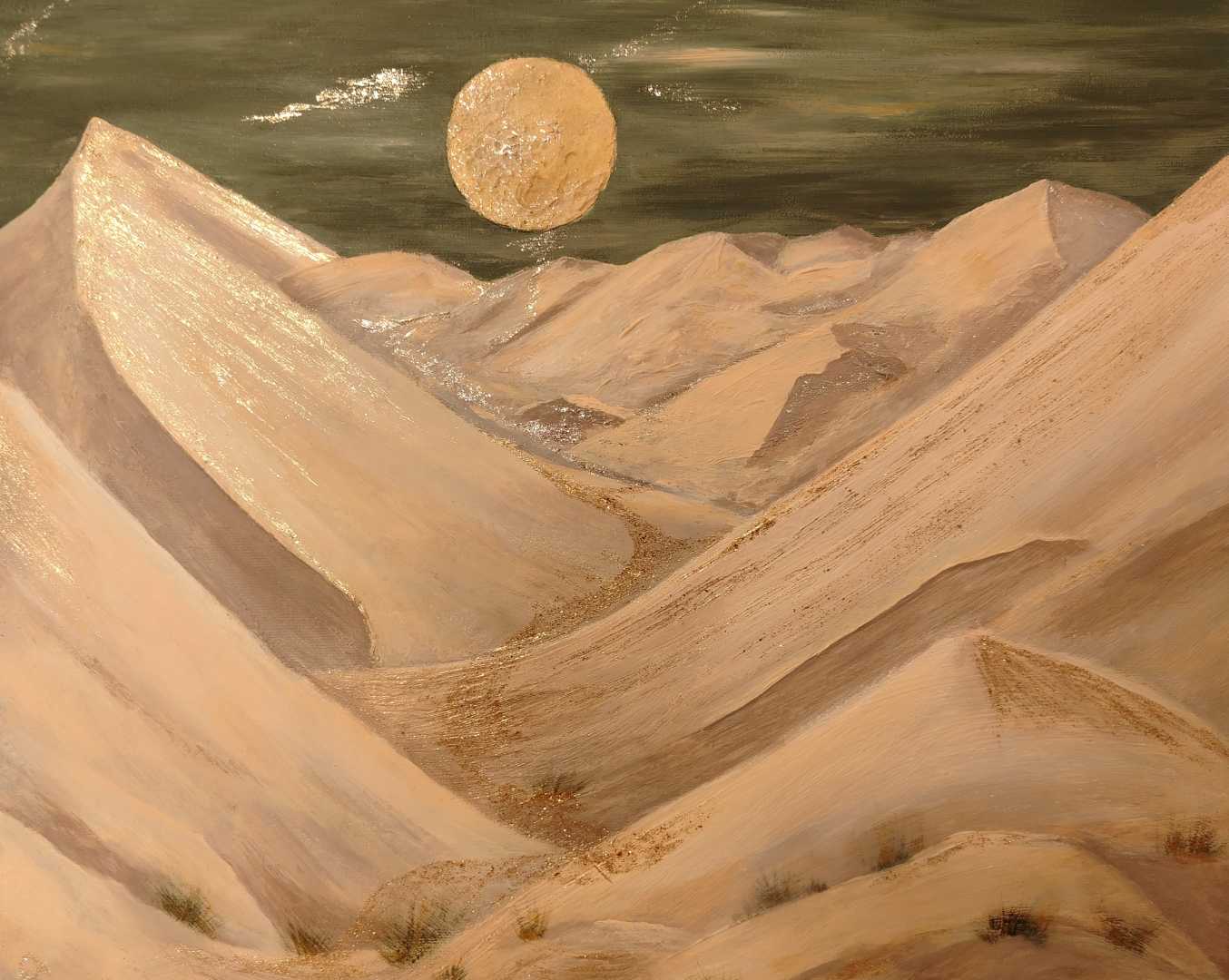 дюны при полной луне. Таинственный лунный свет растекается по песку и создает мягкое сияние на извилистой тропе, указывая путь и освещая дорогу.