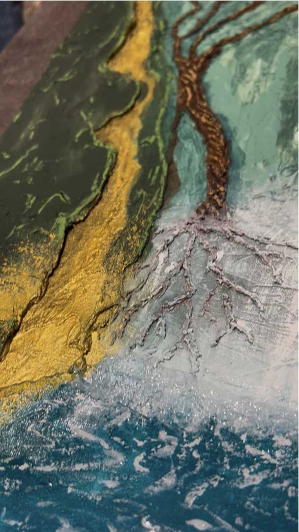т на укрепленном картоне, вся поверхность покрыта текстурной пастой, нижняя часть дополнена эпоксидной смолой .