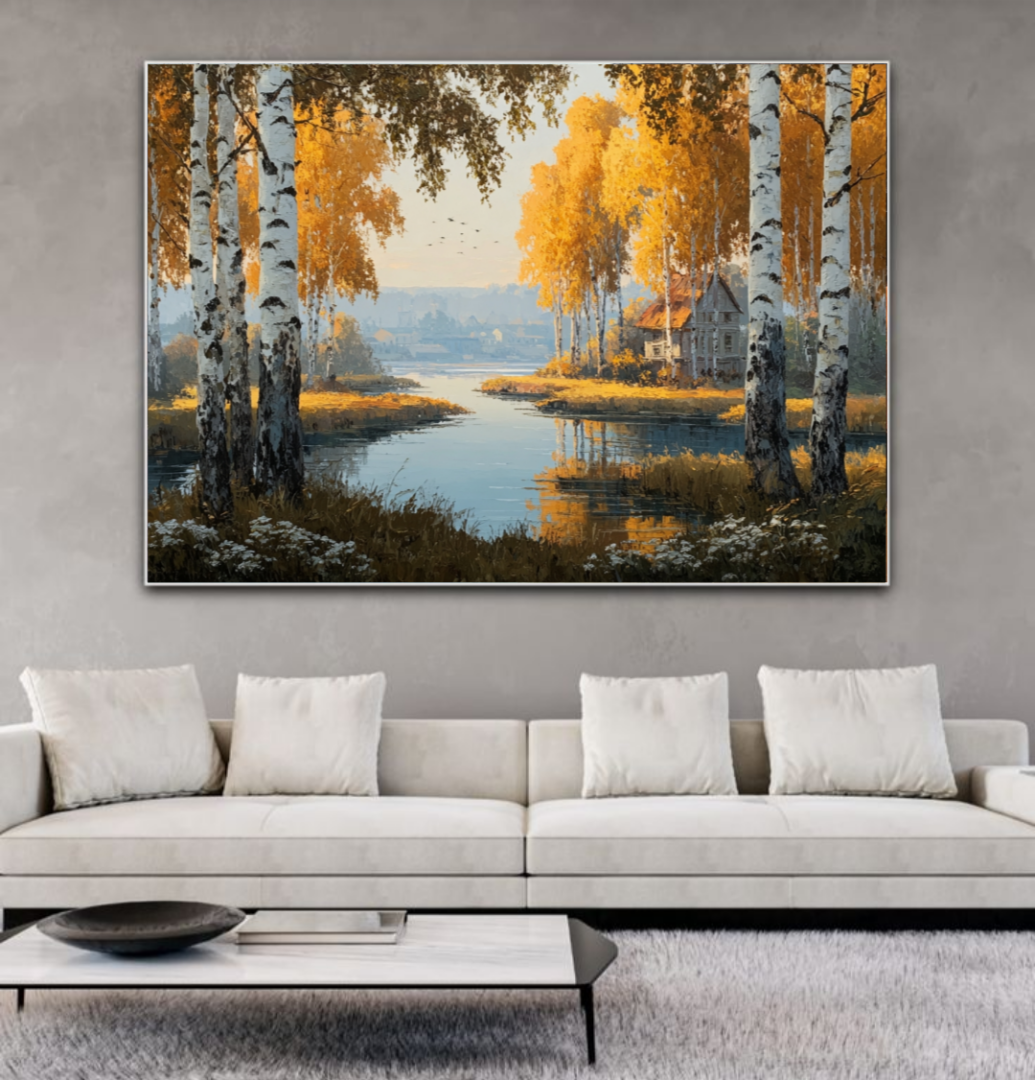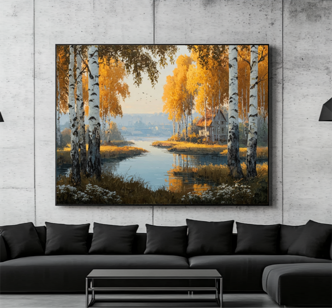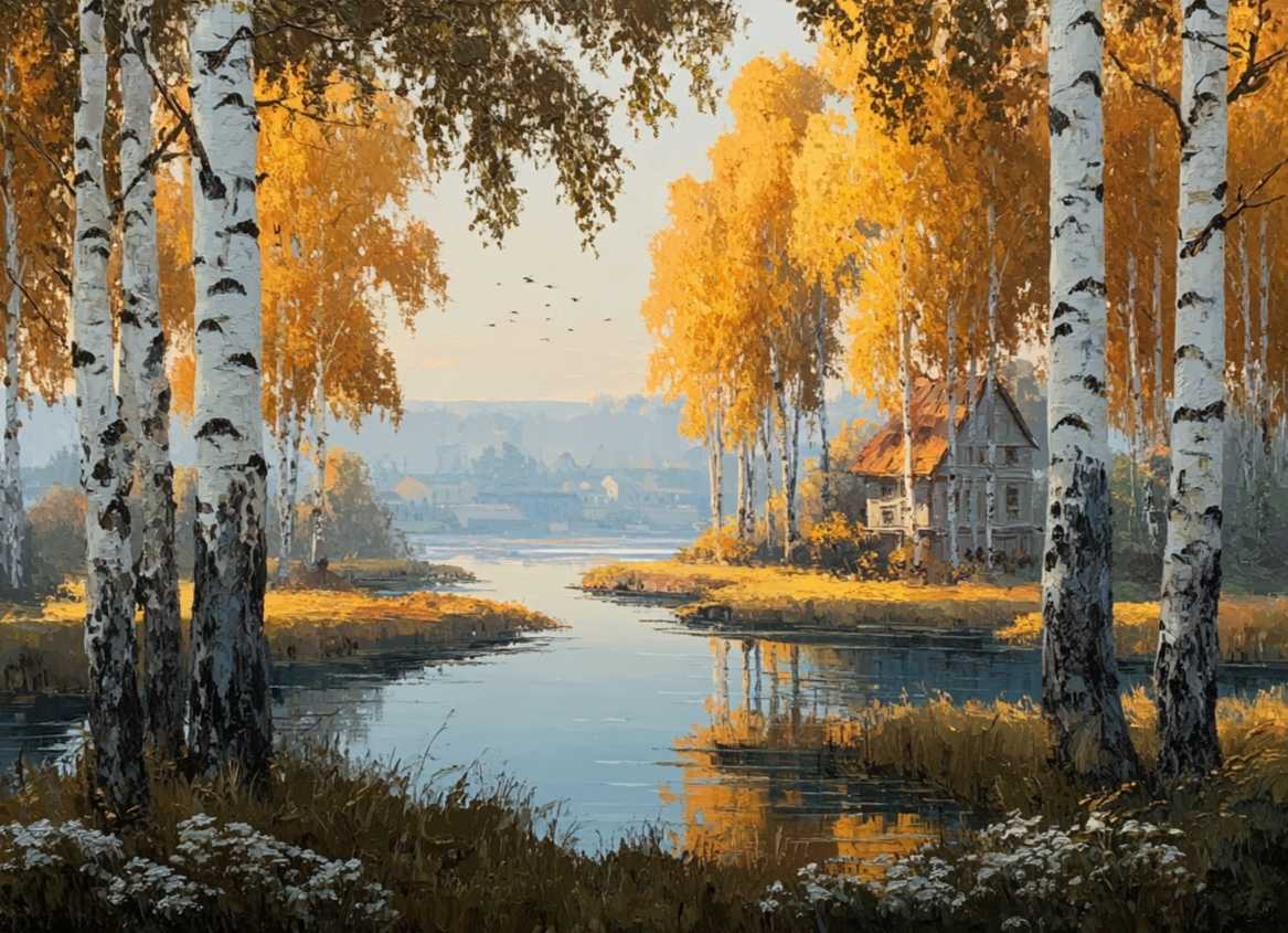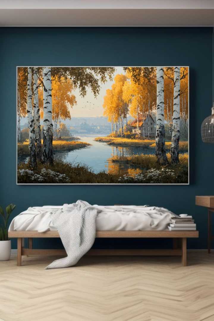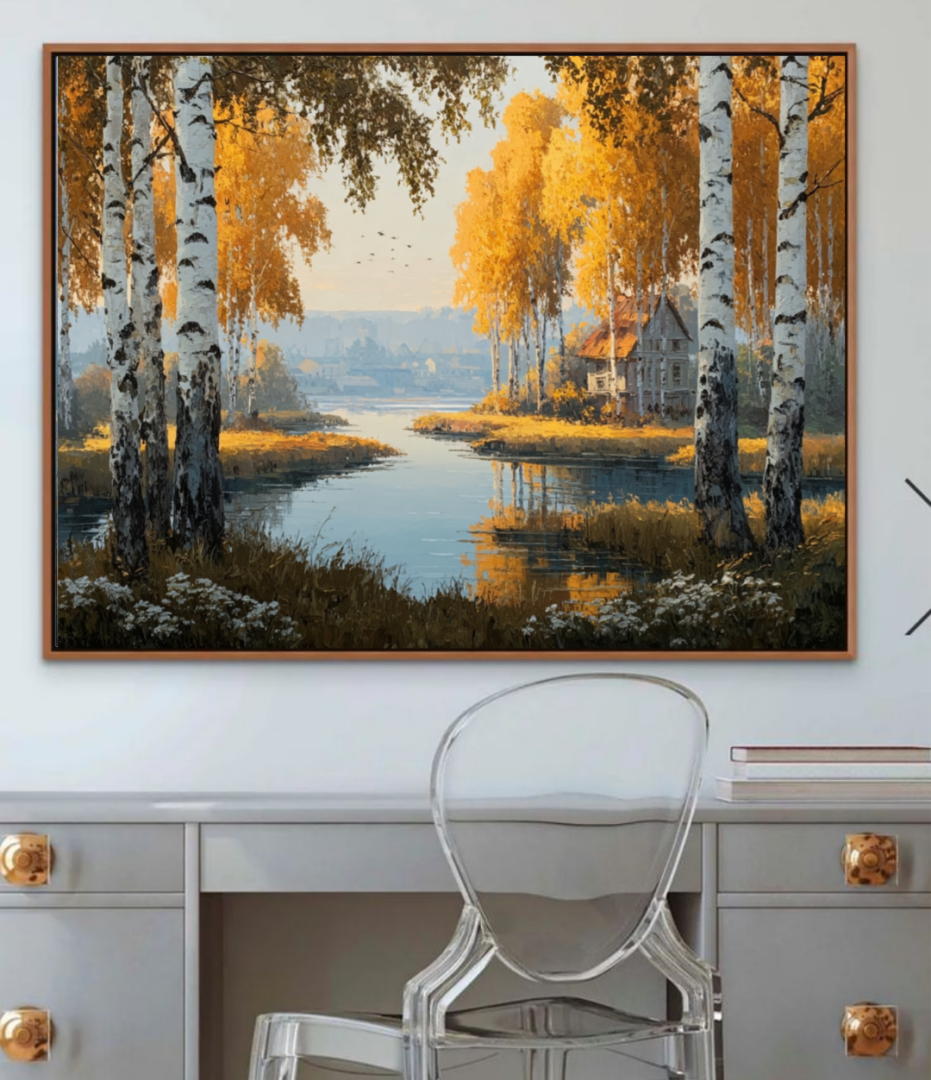 Погрузитесь в атмосферу уюта и тепла с этой великолепной масляной картиной — «Осенний пейзаж. На переднем плане — спокойная река, усыпанная сверкающими золотыми листьями, а берега, усыпанные яркими осенними деревьями, создают ощущение гармонии и красоты природы. Вдали видно очертания живописной дере