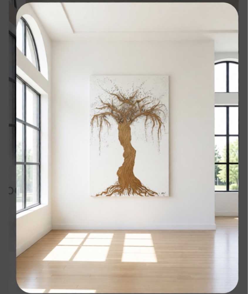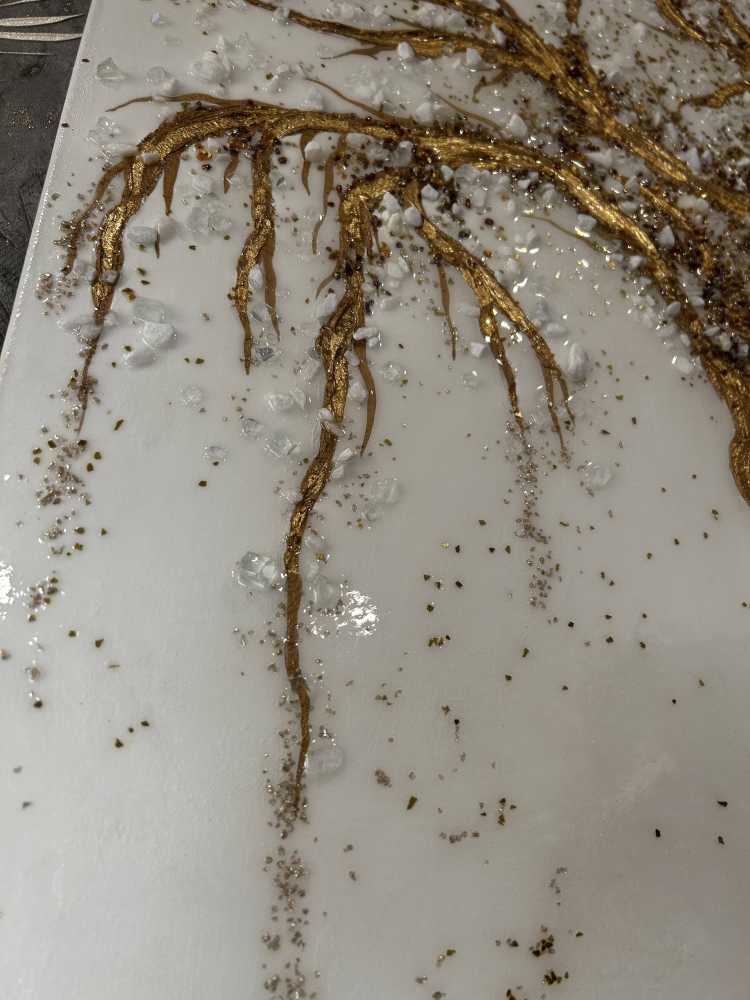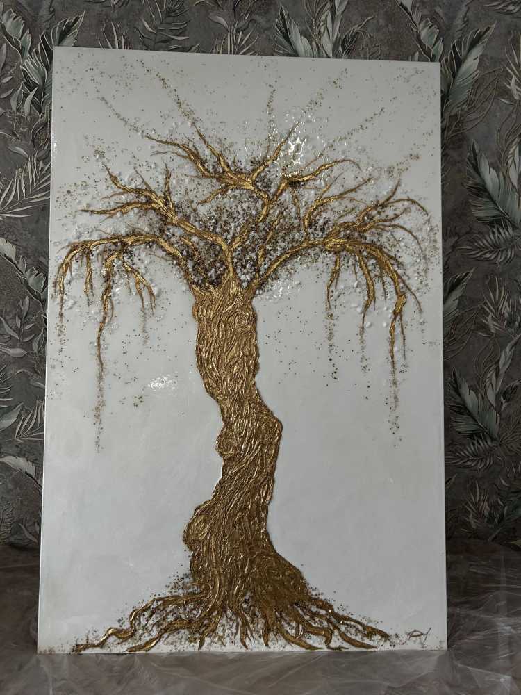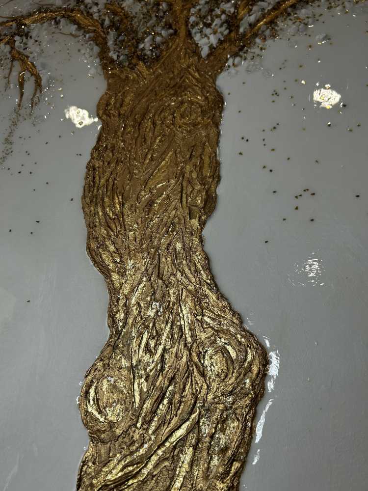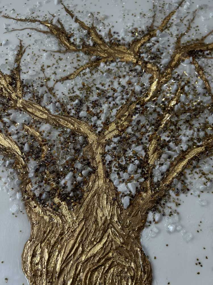 Золотое дерево.Размер 100 на 150 см.Текстурная паста,поталь,стеклянная крошка,зеркальная крошка,гранитная крошка,акрил,эпоксидная смола.