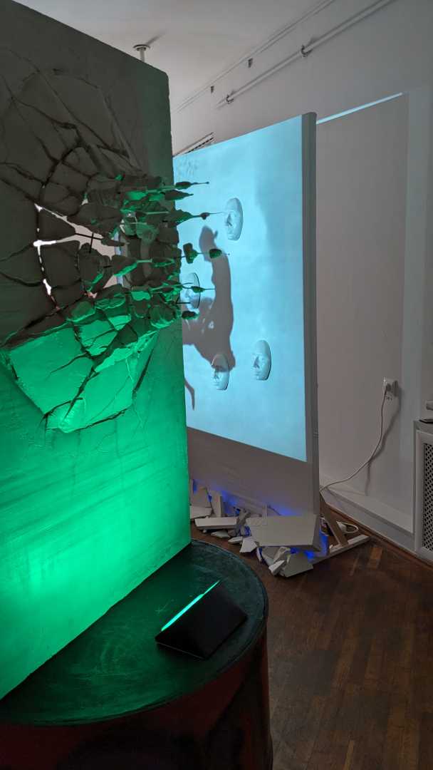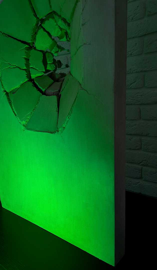 Изделие из гипса передающее образ бетонной плиты которую словно снарядом пробивает сгусток воды выбивая из плиты куски бетона и арматуру. Вода в скульптуре передана с помощью эпоксидной смолы. Бетонная плита символизирует нечто исключительно прочное и незыблемое, в то время как вода которая пробивае