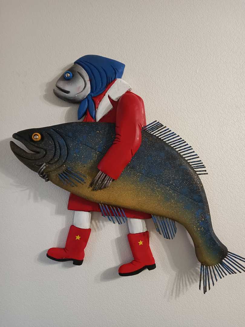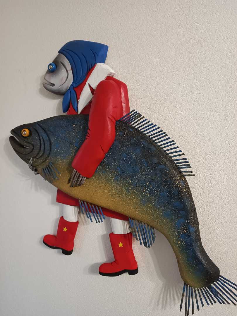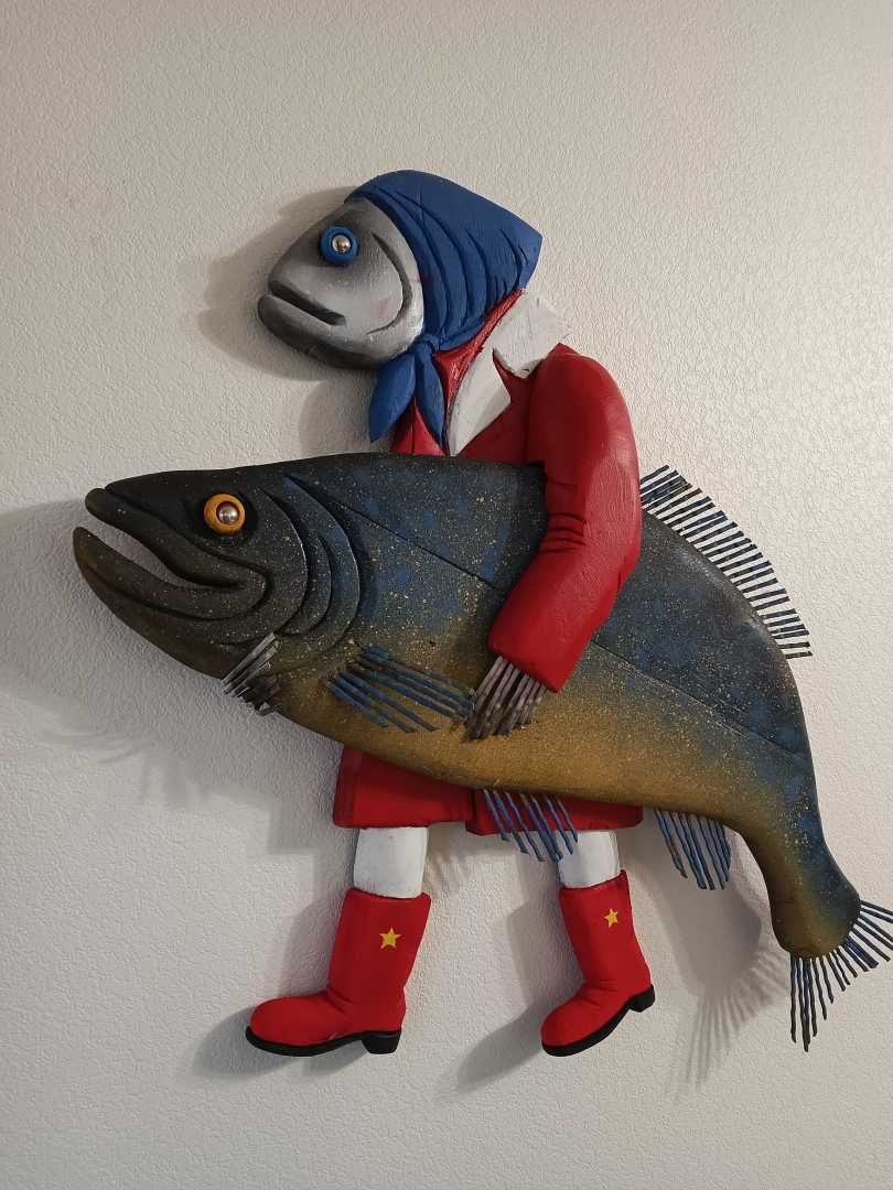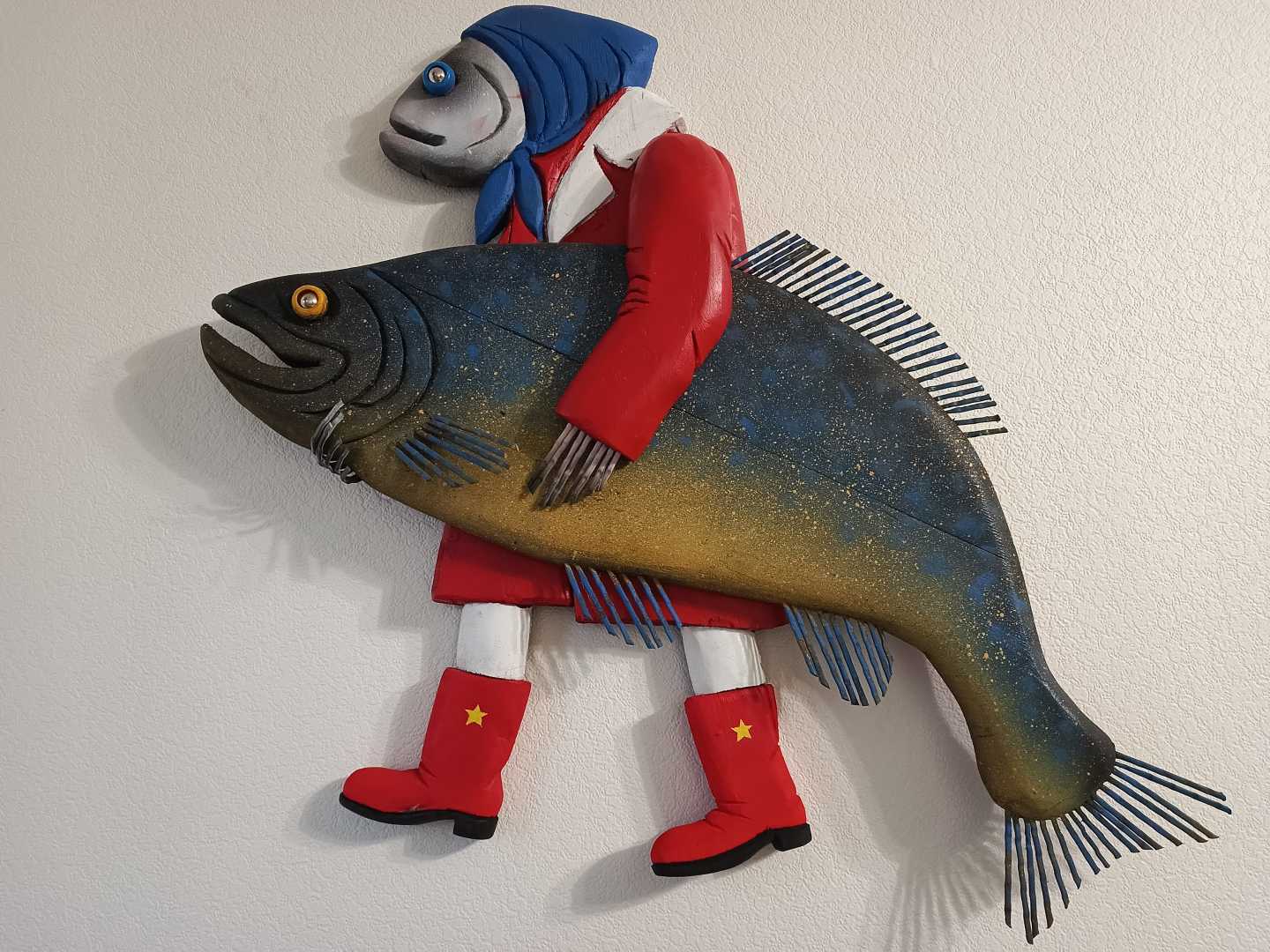 Рыба похищает рыбу. Никакой политики. Автор:Hakaro. 2025г. Размер: 60см х 70см. Материал: дерево, пластик. Имеет крепление на стену.