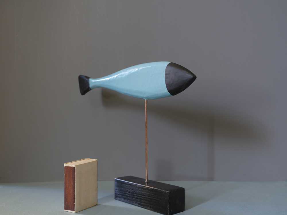 Голубая рыба с черной головой, деревянная фигурка на  подставке. Напоминает  торпеду  с самонаводящейся головой. Голубой жизнь, черный смерть.  Минимализм.