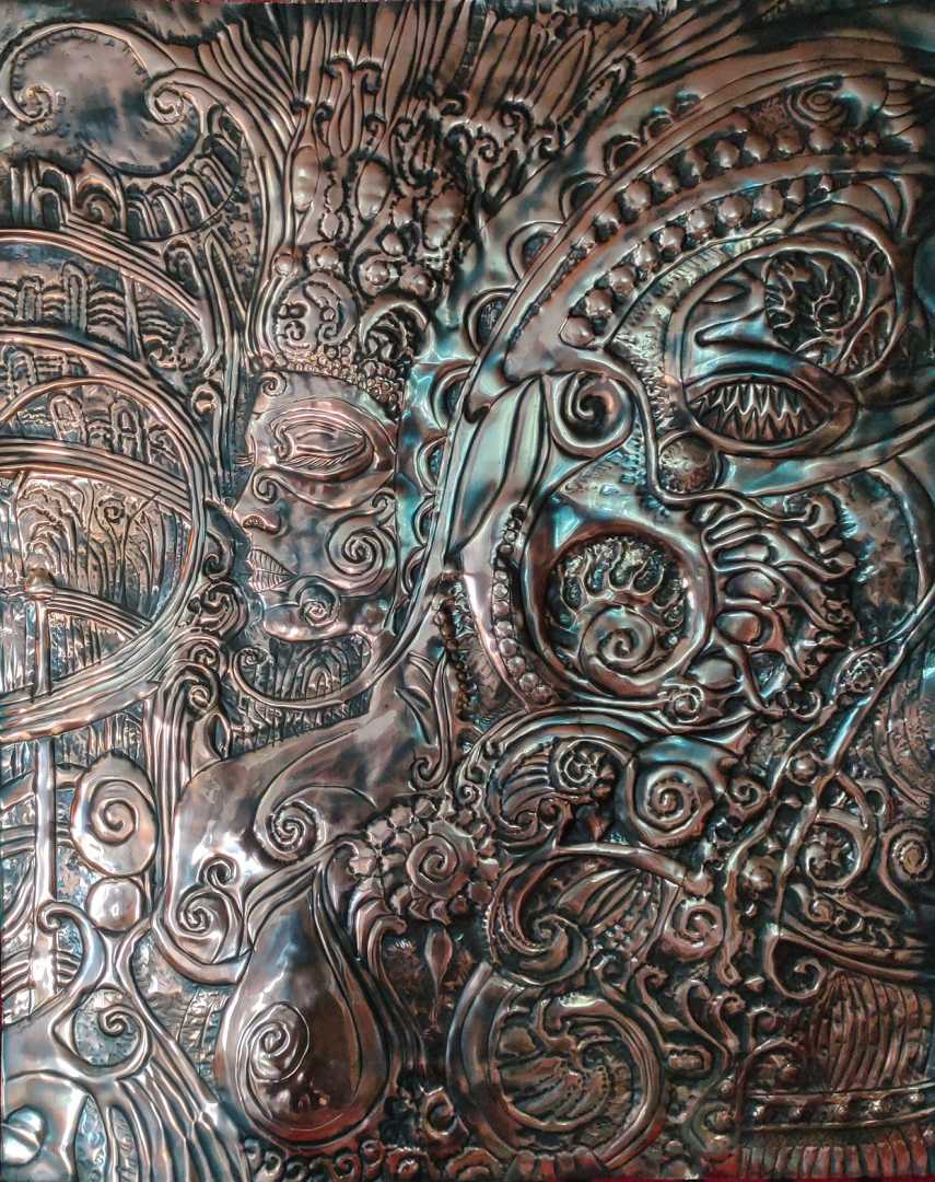 Авторская картина в технике чеканки по меди с образной композицией «Королева жемчужины». Рельефная поверхность и металлический блеск создают выразительный художественный эффект.