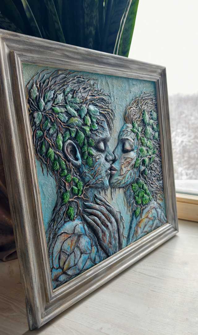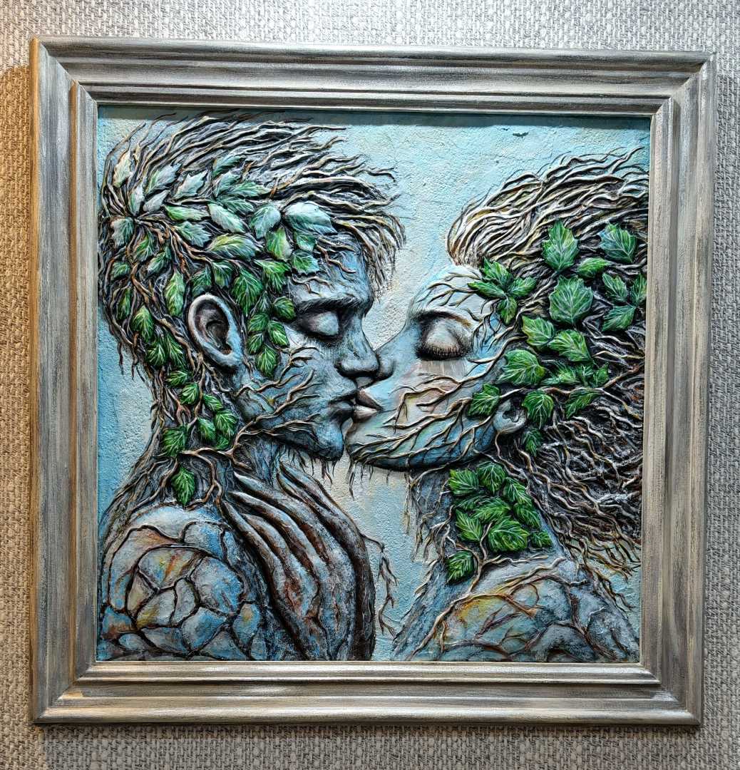 «Влюблённые»— Скульптурная картина, где две фигуры тянутся друг к другу за поцелуем, их человеческие формы сливаются с природой. Волосы превращаются в ветви, корни и листья, протягиваясь как невидимые нити между ними — визуальная метафора невидимых уз любви. Созданная из гипса, дерева и штукатурки,